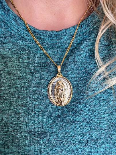 18k Gold Filled Hollowed Oval Lady of Guadalupe Pendant Featuring Rose Gold Detail, Stainless Steel Plate, Wholesale Jewelry Making Supplies