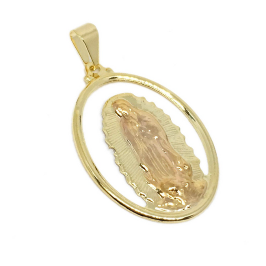 18k Gold Filled Hollowed Oval Lady of Guadalupe Pendant Featuring Rose Gold Detail For Wholesale Jewelry Making Supplies