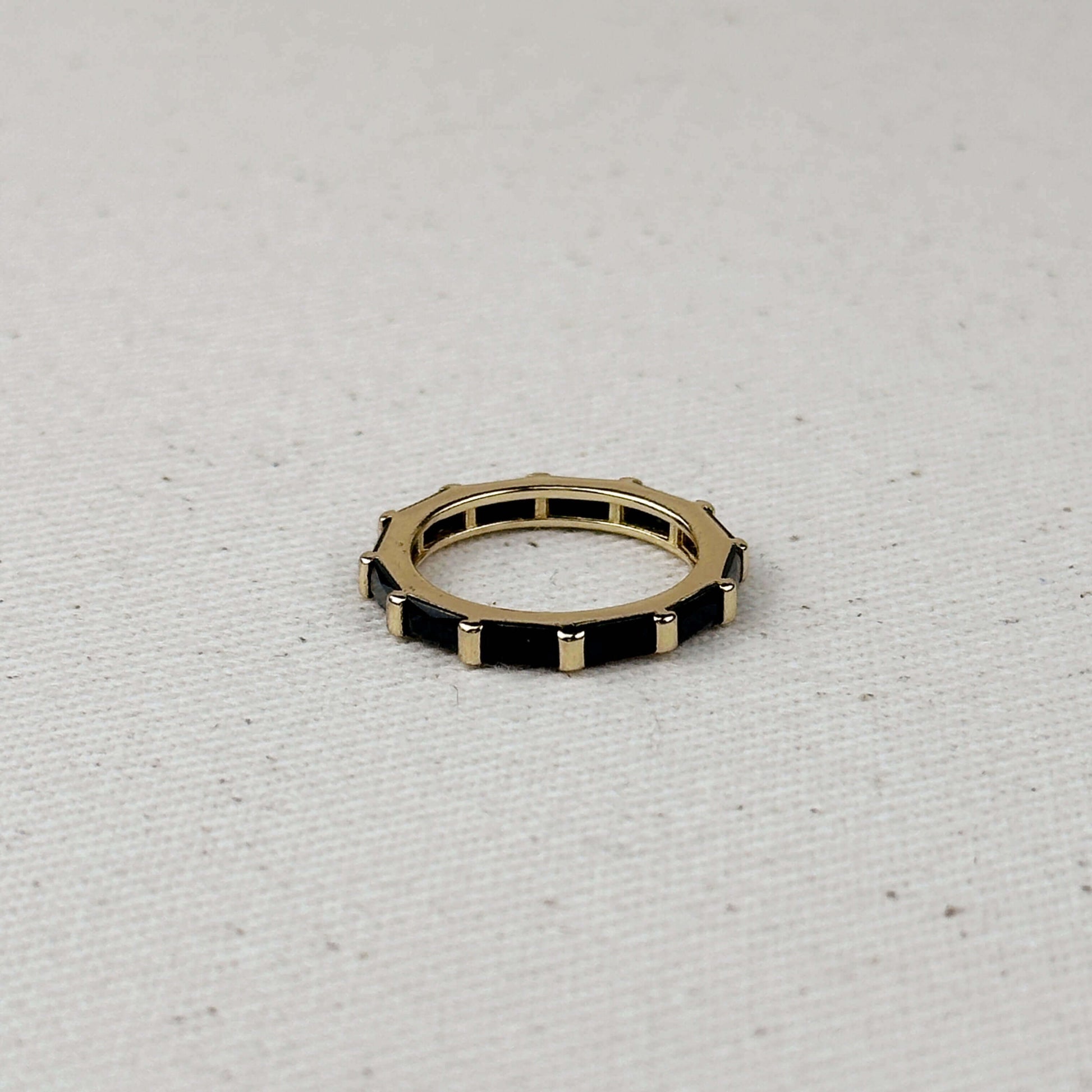 Elevate your ring game with this gorgeous baguette CZ band ring featuring brilliant rectangular-cut cubic zirconia stones. Perfect for stacking or wearing solo, this luxurious 18K gold-filled ring adds instant glamour to any look.