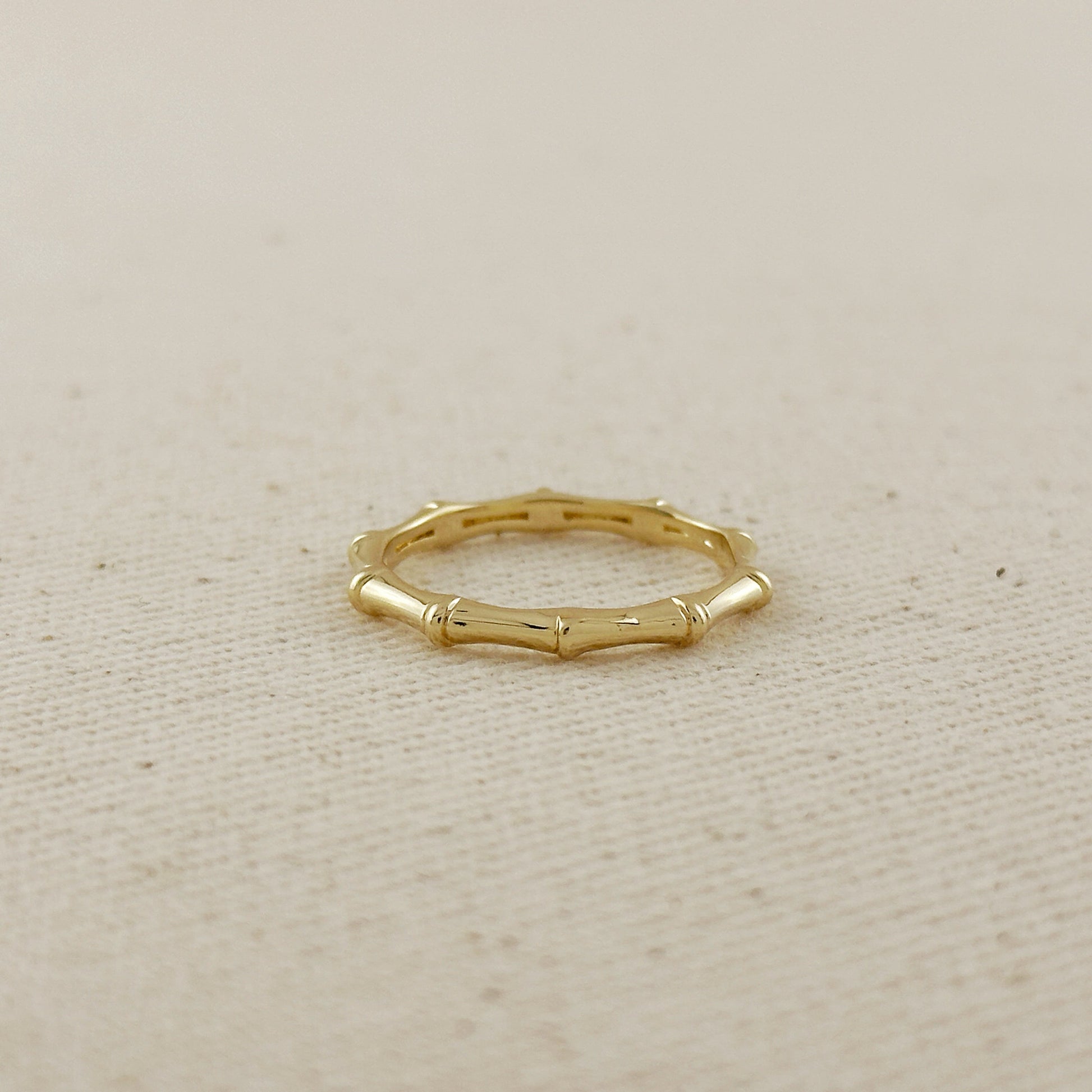 Embrace the organic sophistication of nature with this stunning 18K gold filled bamboo band ring. Featuring intricate bamboo node patterns that wrap around the entire band, this unique piece captures the graceful beauty of bamboo stems in luxurious gold. Perfect for the woman who appreciates distinctive design with timeless appeal.
