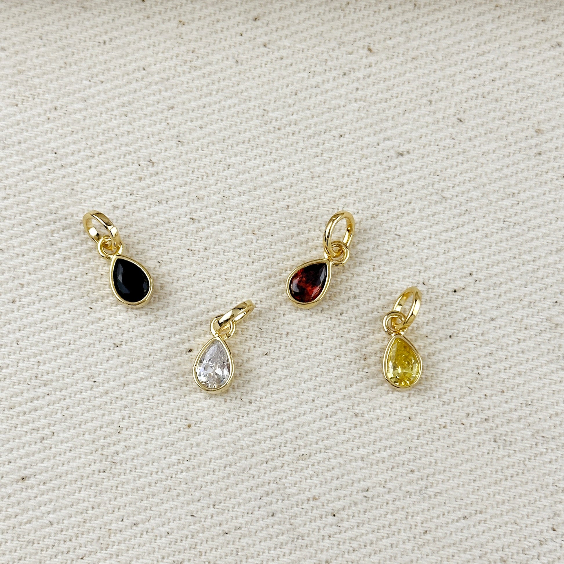 Elevate your personal style with our exquisite 18k gold-filled Colored CZ Drop Charm, available in four stunning variations: Clear, Onyx, Yellow Topaz, and Garnet. Each charm offers a unique splash of color and brilliance, crafted to complement any jewelry collection.