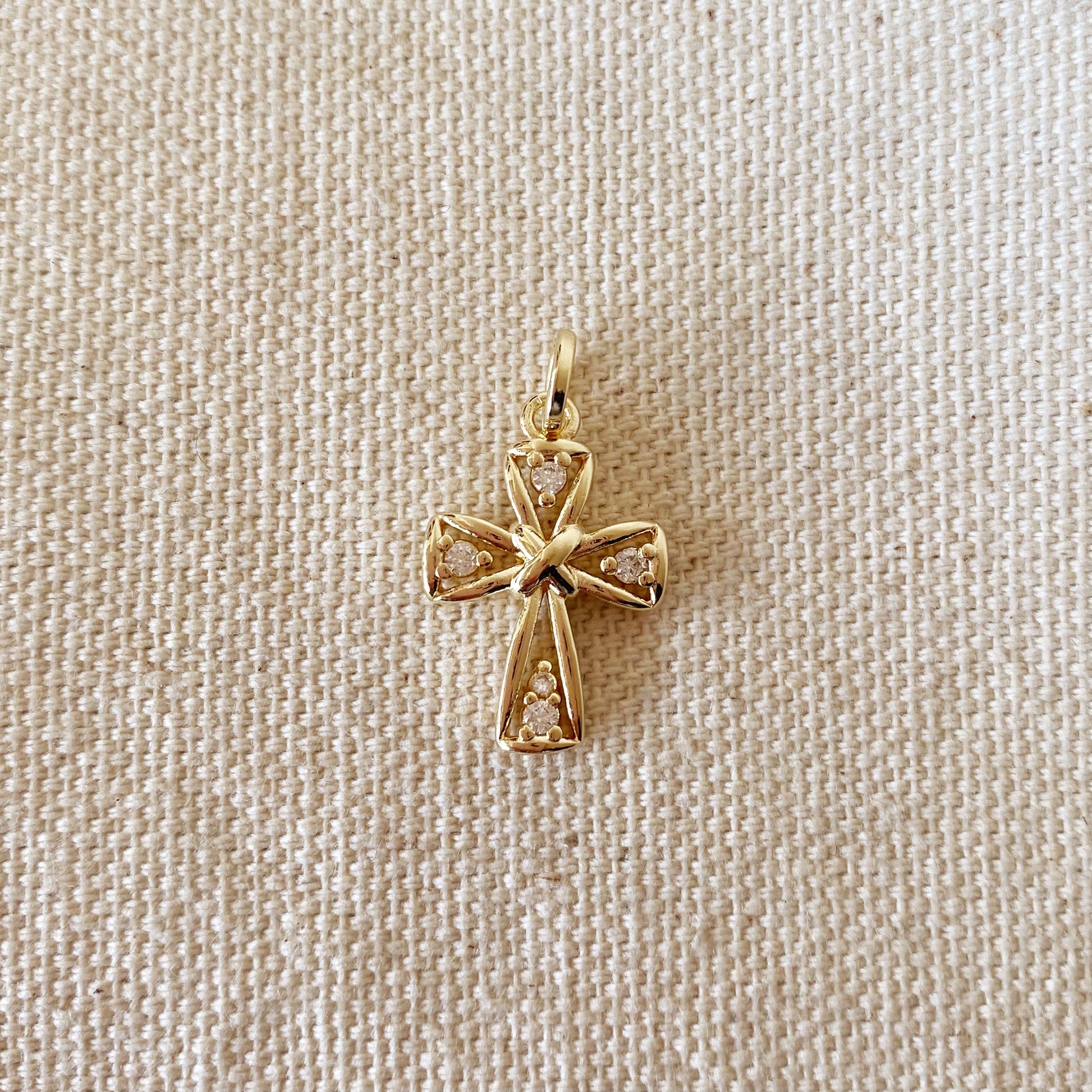 This striking 18k Gold Filled Cross features an intricate, hand-crafted design adorned with four gorgeous cubic zirconia stones. With an iconic love-knot at its center, this exquisite piece is a meaningful and memorable gift for your family and friends, conveying your faith and love.