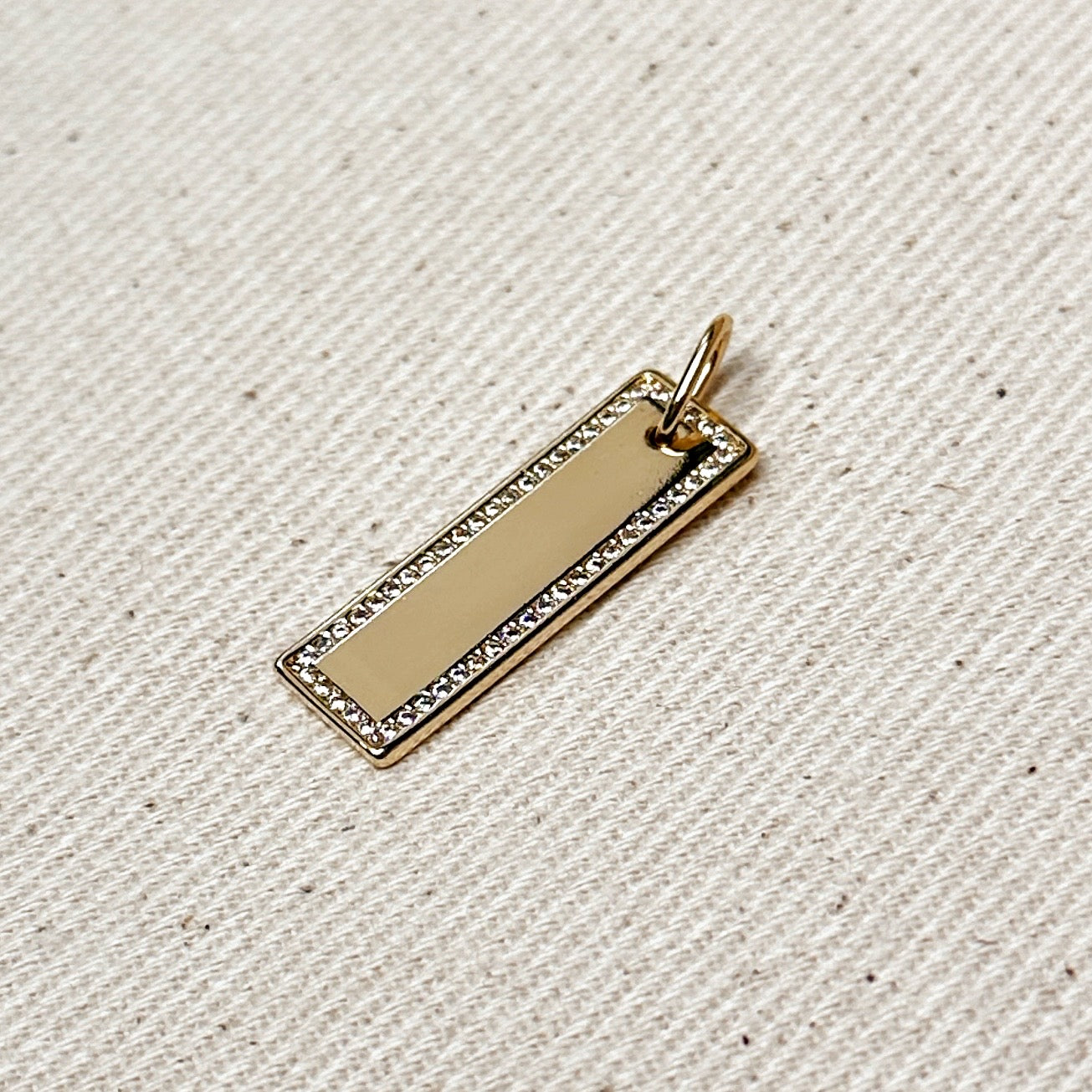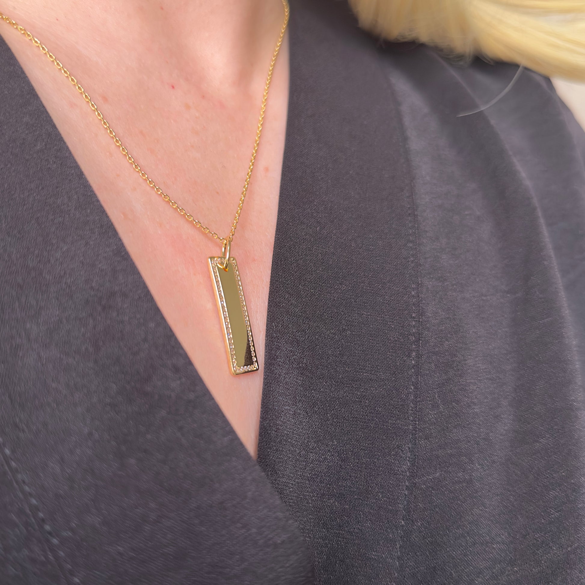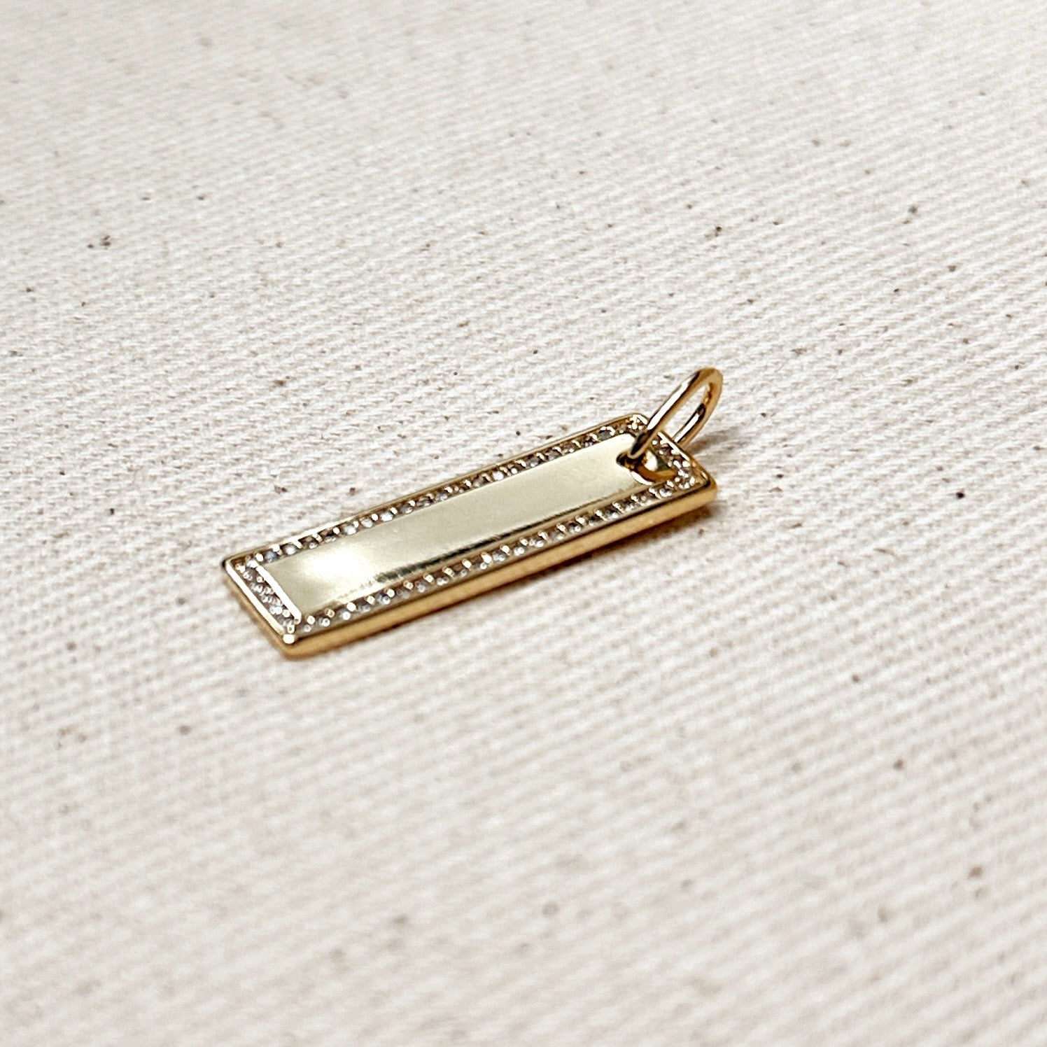 Indulge in the contemporary style of our 18k Gold Filled CZ Bar Pendant. Its sleek design adds a touch of elegance to any outfit, while the sparkling CZ stones provide a touch of glamour. Elevate your look with this stunning accessory!