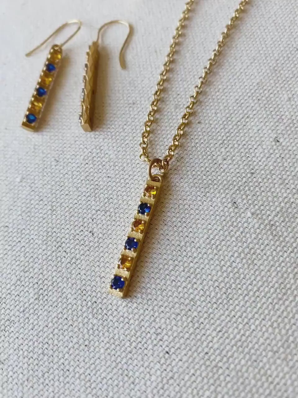 Gorgeous Modern Style Bar Set of Earrings, Necklace and Ring made in 18k Gold filled and cubic zirconia, in sapphire and topaz. You may purchase the pieces separately. Earrings wire base metal of silver 925 plated with 18k gold.
