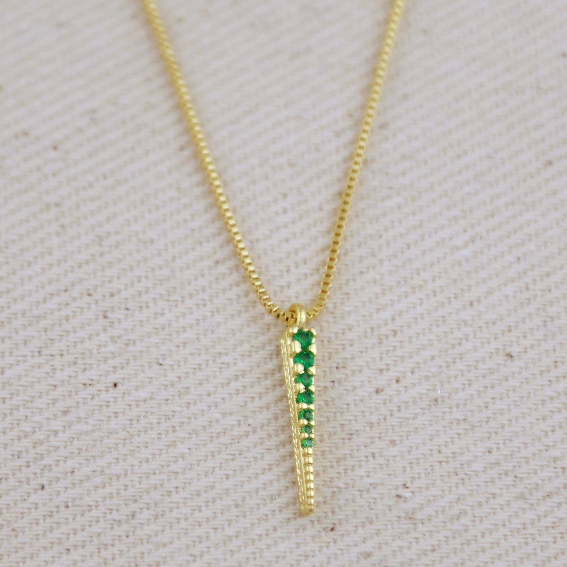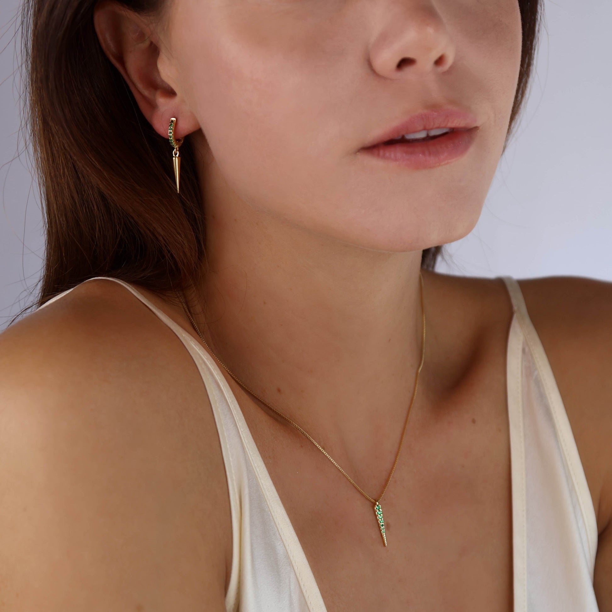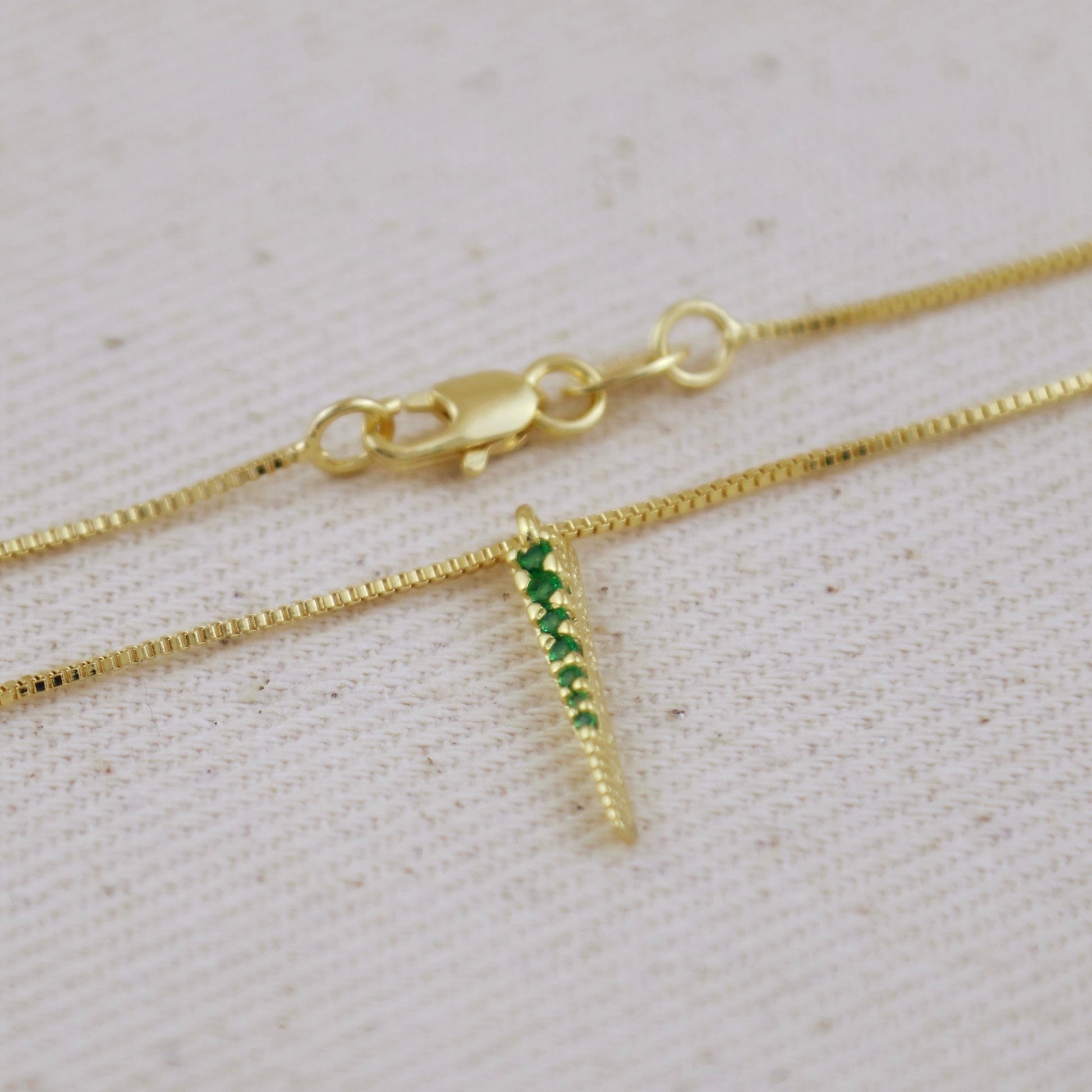 This 18k Gold Filled Emerald CZ Spear Necklace is the perfect way to add a touch of fun to your everyday minimalist look. Its sleek design and classic charm create a look that can go from day to night. Enjoy a touch of luxury with this timeless piece.