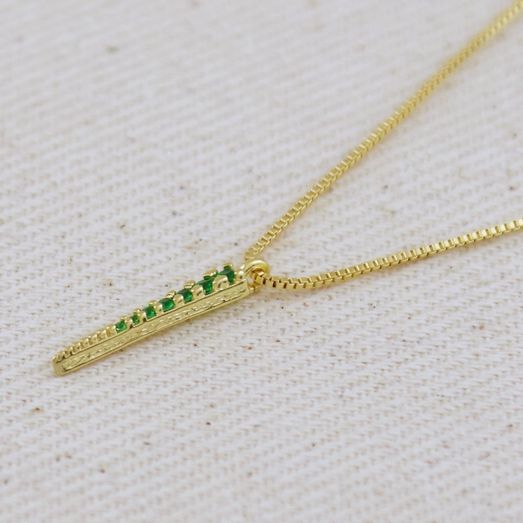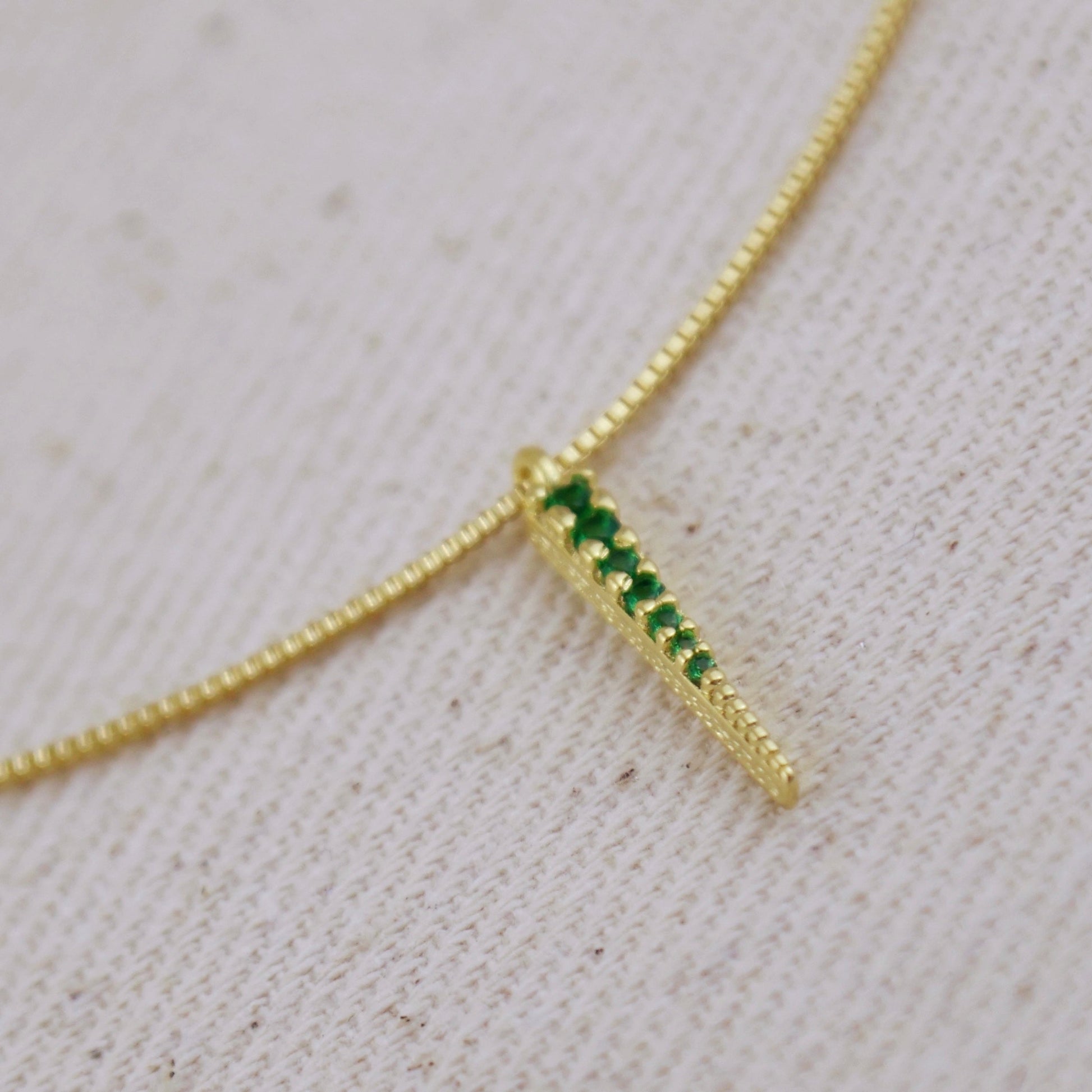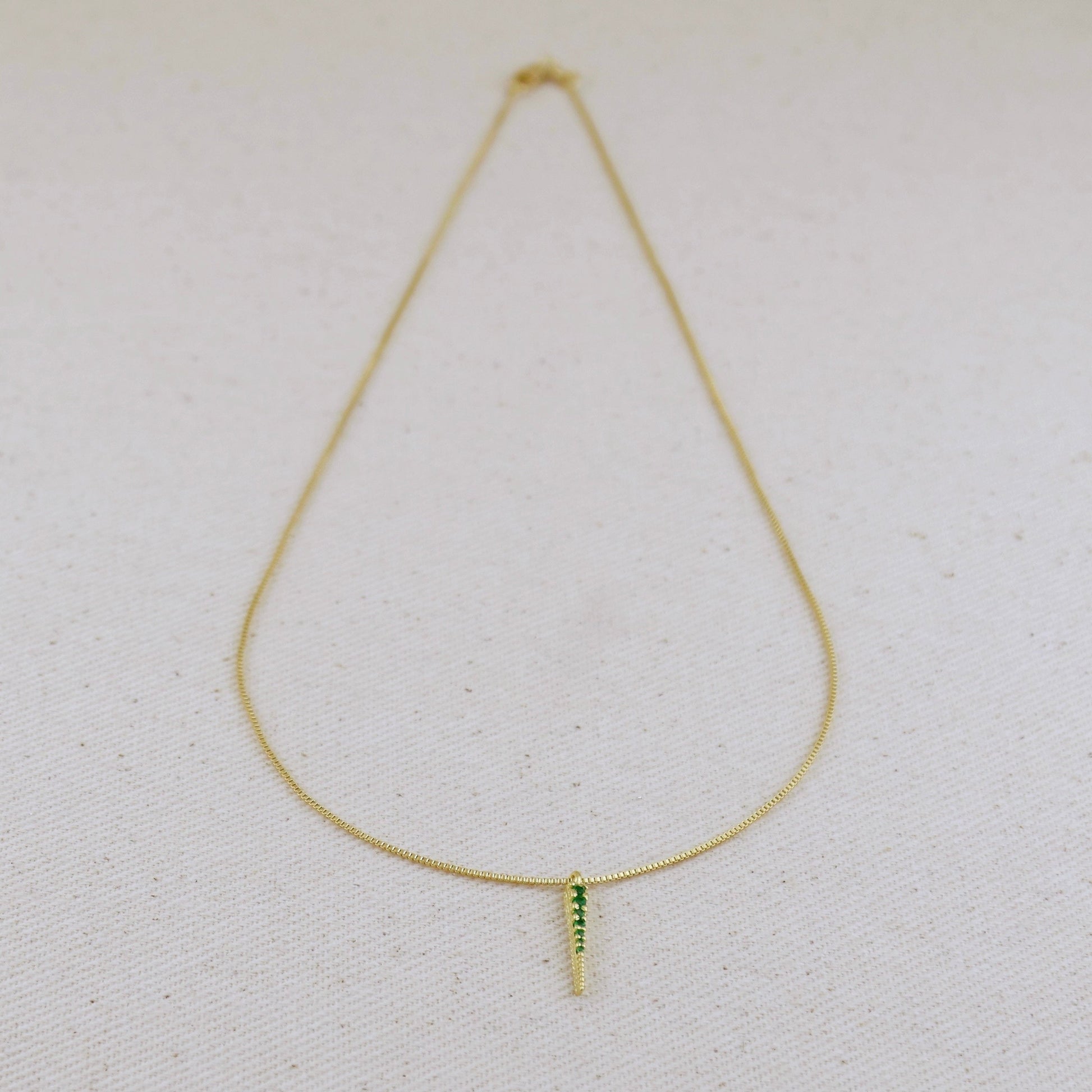 This 18k Gold Filled Emerald CZ Spear Necklace is the perfect way to add a touch of fun to your everyday minimalist look. Its sleek design and classic charm create a look that can go from day to night. Enjoy a touch of luxury with this timeless piece.