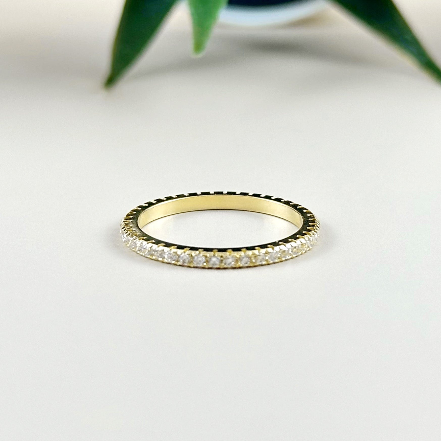 - Full Eternity Design: Micro 1mm CZ stones encircle the entire 1.8mm band
