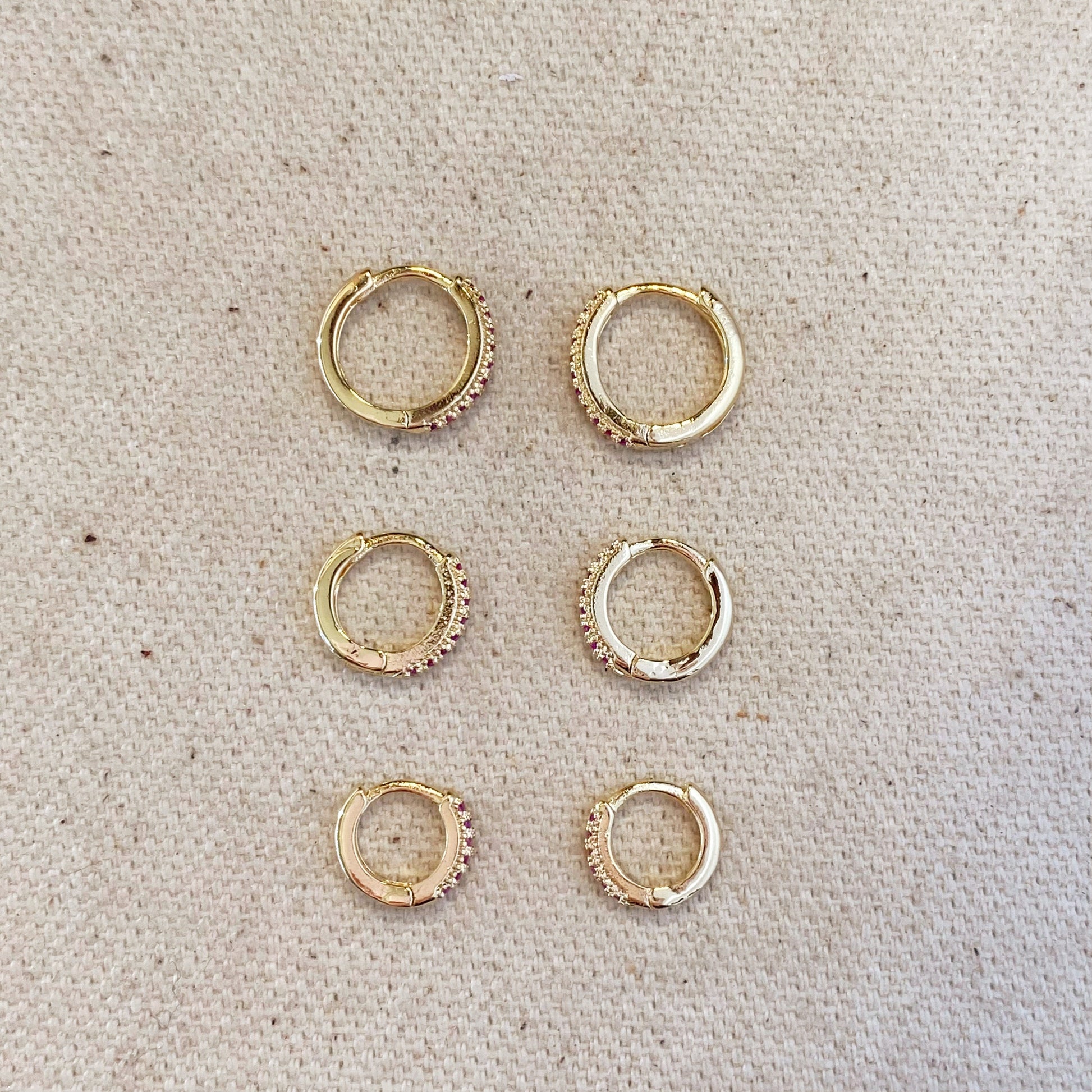 Not one, nor two, but three huggies featuring a fashionable Fuchsia cubic zirconia to facilitate your choice of which size to wear.