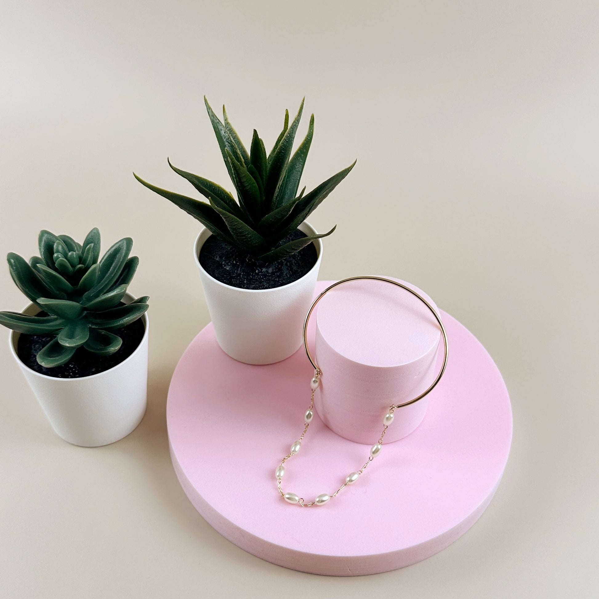Make an elegant statement with this stunning 18k gold filled pearl cuff bracelet featuring a distinctive twisted design adorned with lustrous elliptical pearls. This sophisticated open bangle combines timeless pearl elegance with modern geometric styling for a truly unique accessory.