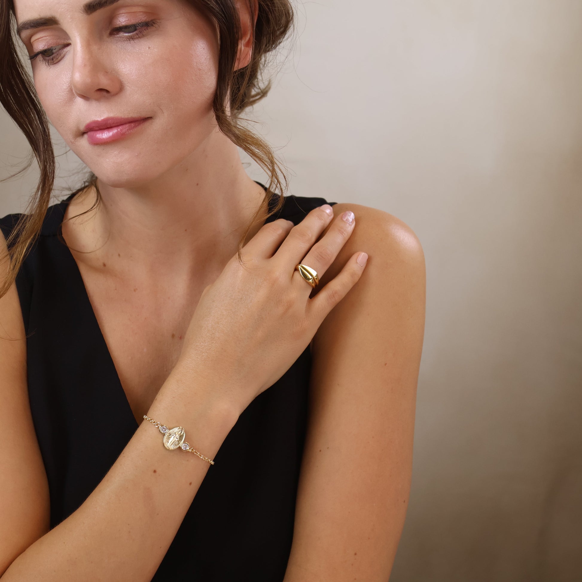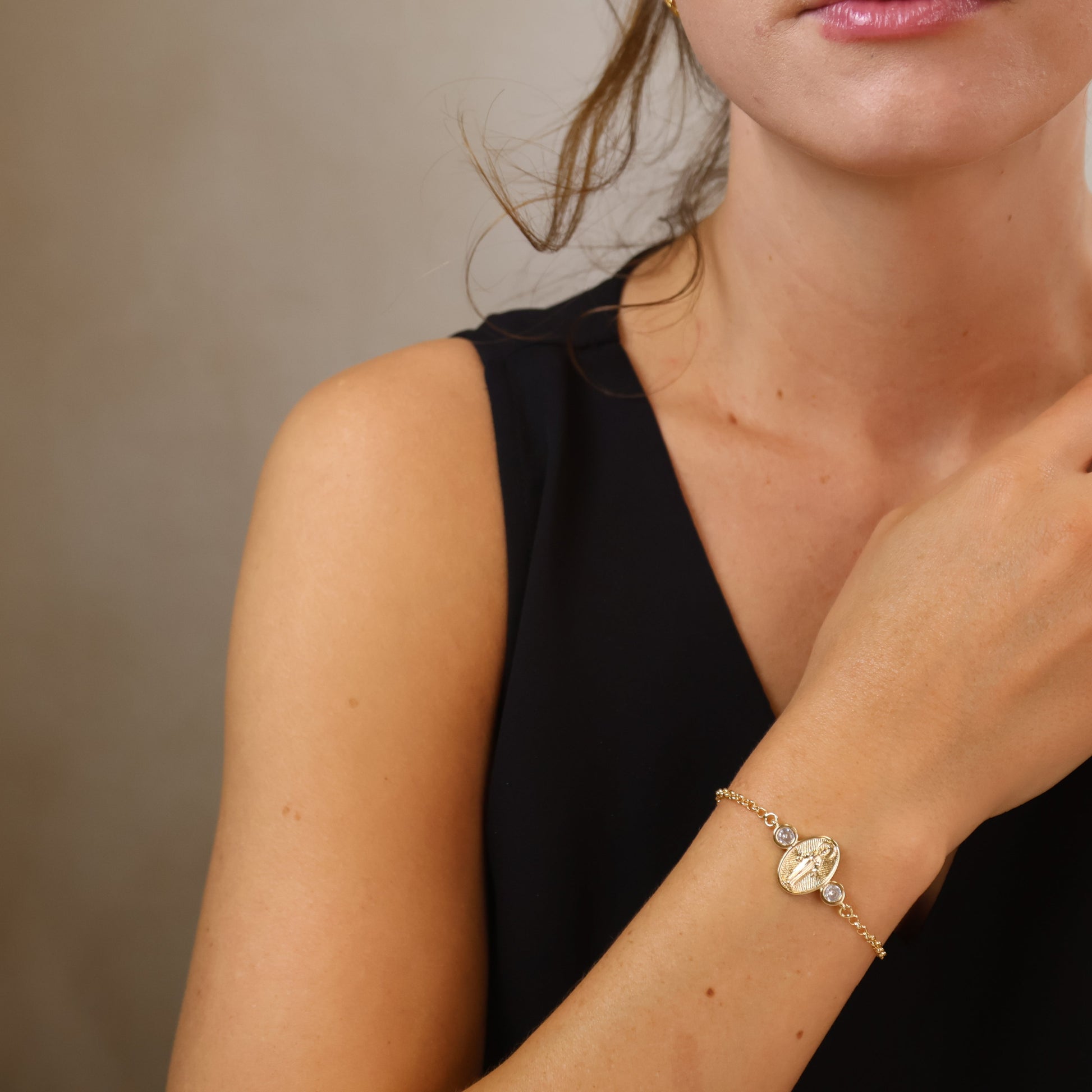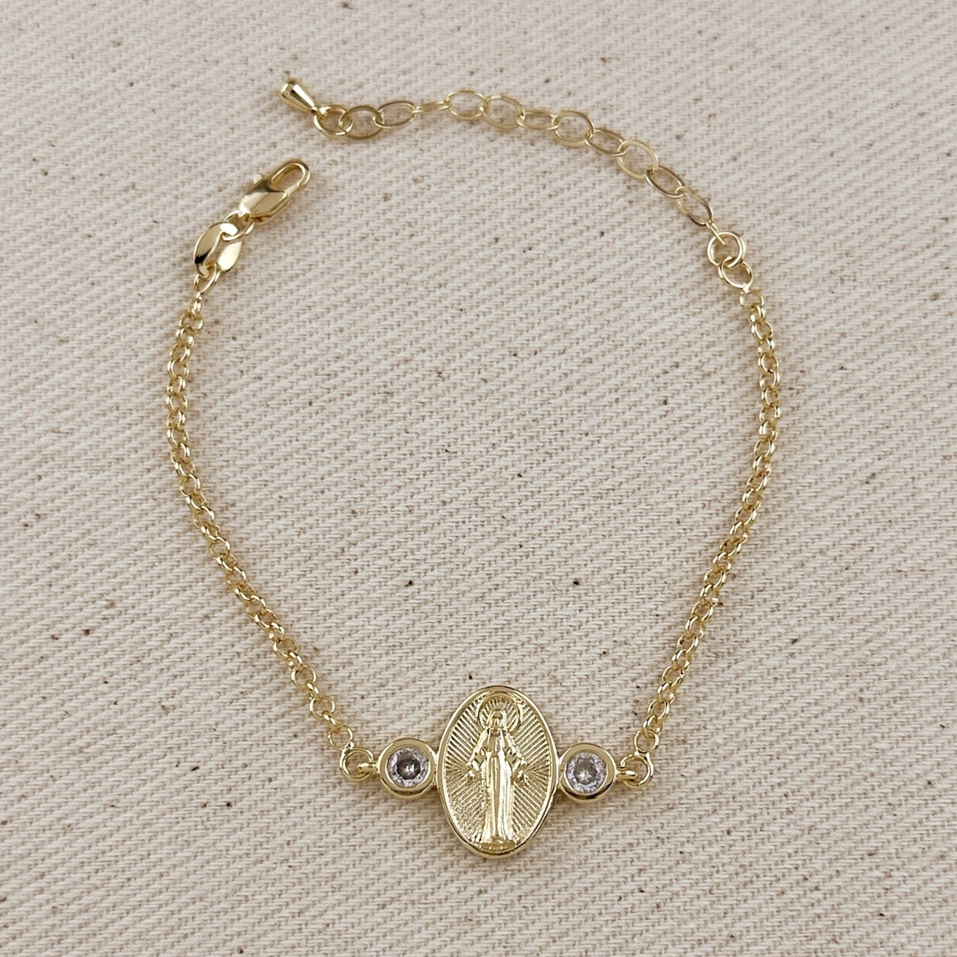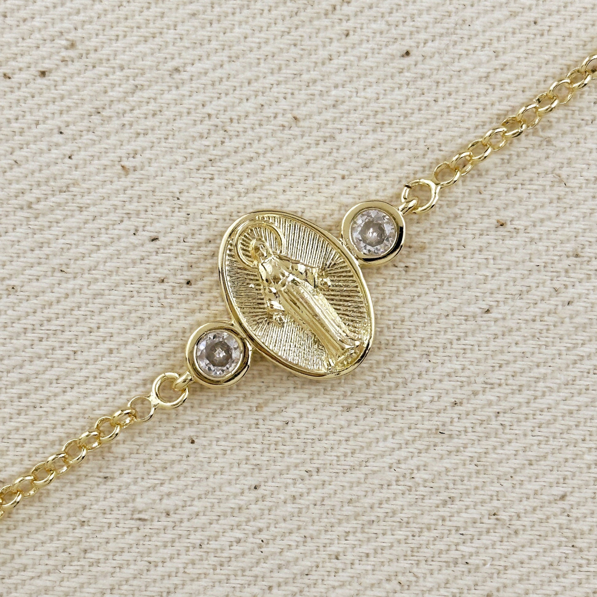 Elevate your style with our 18k Gold Filled Lady Of Grace Bracelet with CZ Stones. This exquisite piece features a graceful Lady of Grace medallion centerpiece, surrounded by sparkling cubic zirconia stones. The 18k gold-filled construction offers durability and luxury, while the delicate yet sturdy chain ensures comfortable wear. Measuring 6 inches with a 1.5-inch extender, this bracelet accommodates various wrist sizes. Perfect for daily inspiration or special occasions, it's an ideal personal accessory or thoughtful gift. Remember to avoid chemical exposure and remove before swimming to preserve its beauty. This bracelet beautifully combines faith and fashion in one elegant design.