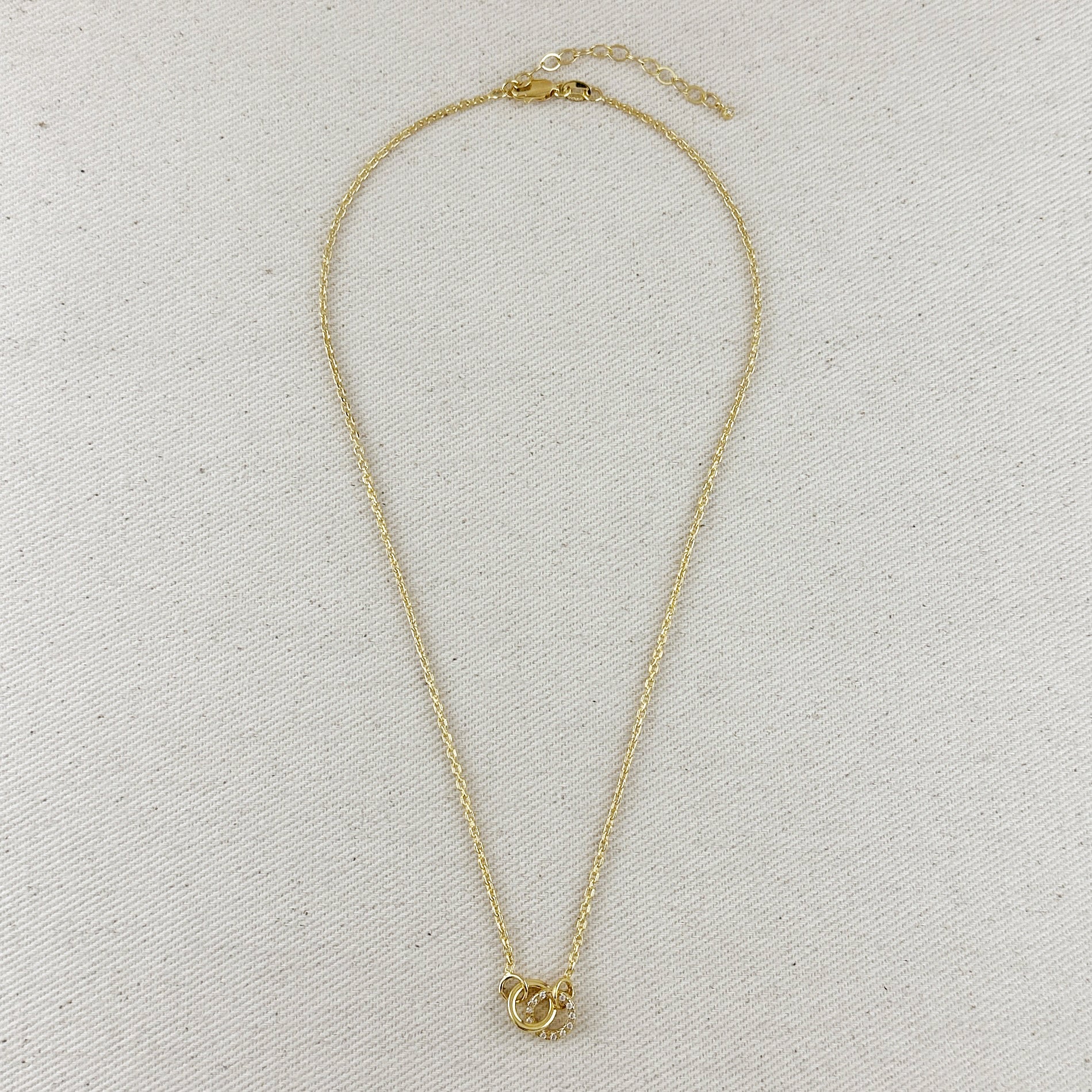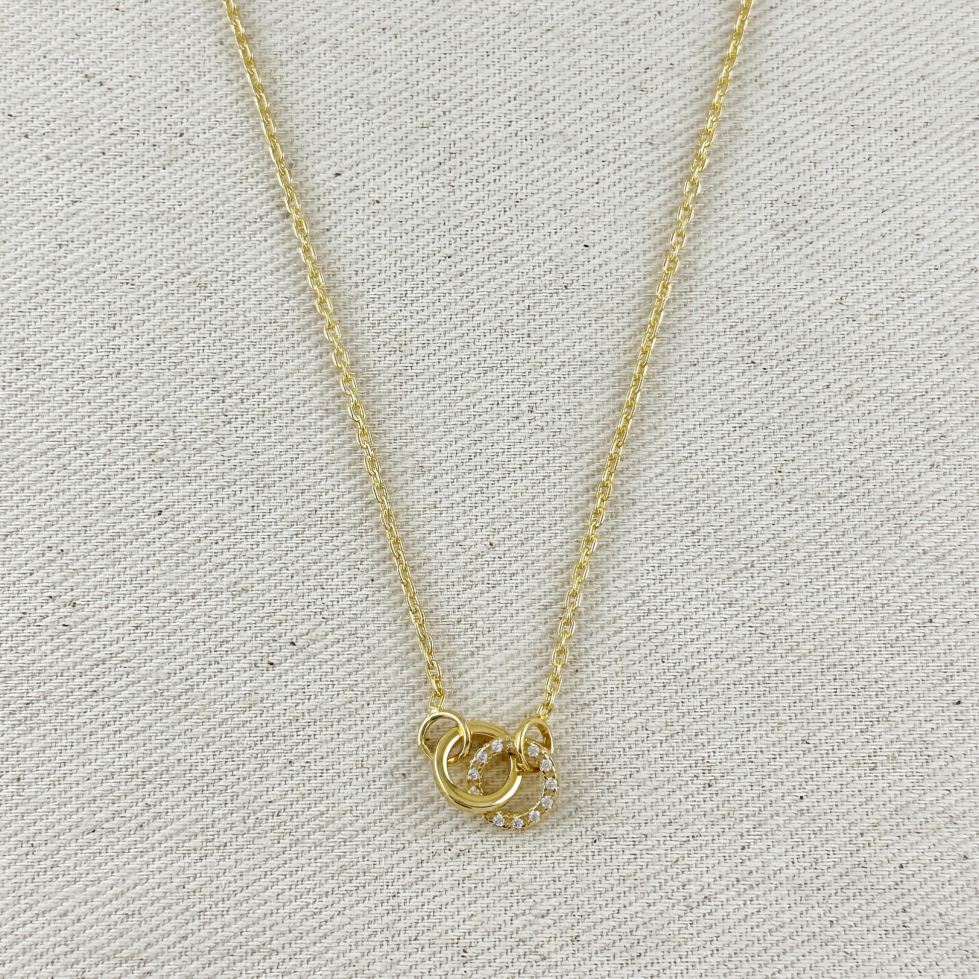 Elevate your style with our stunning 18k Gold Filled Linked CZ Necklace. This elegant piece features a captivating centerpiece of two interlocking circles—one adorned with brilliant cubic zirconia stones that catch and reflect light beautifully, and one polished to a high shine for sophisticated contrast.