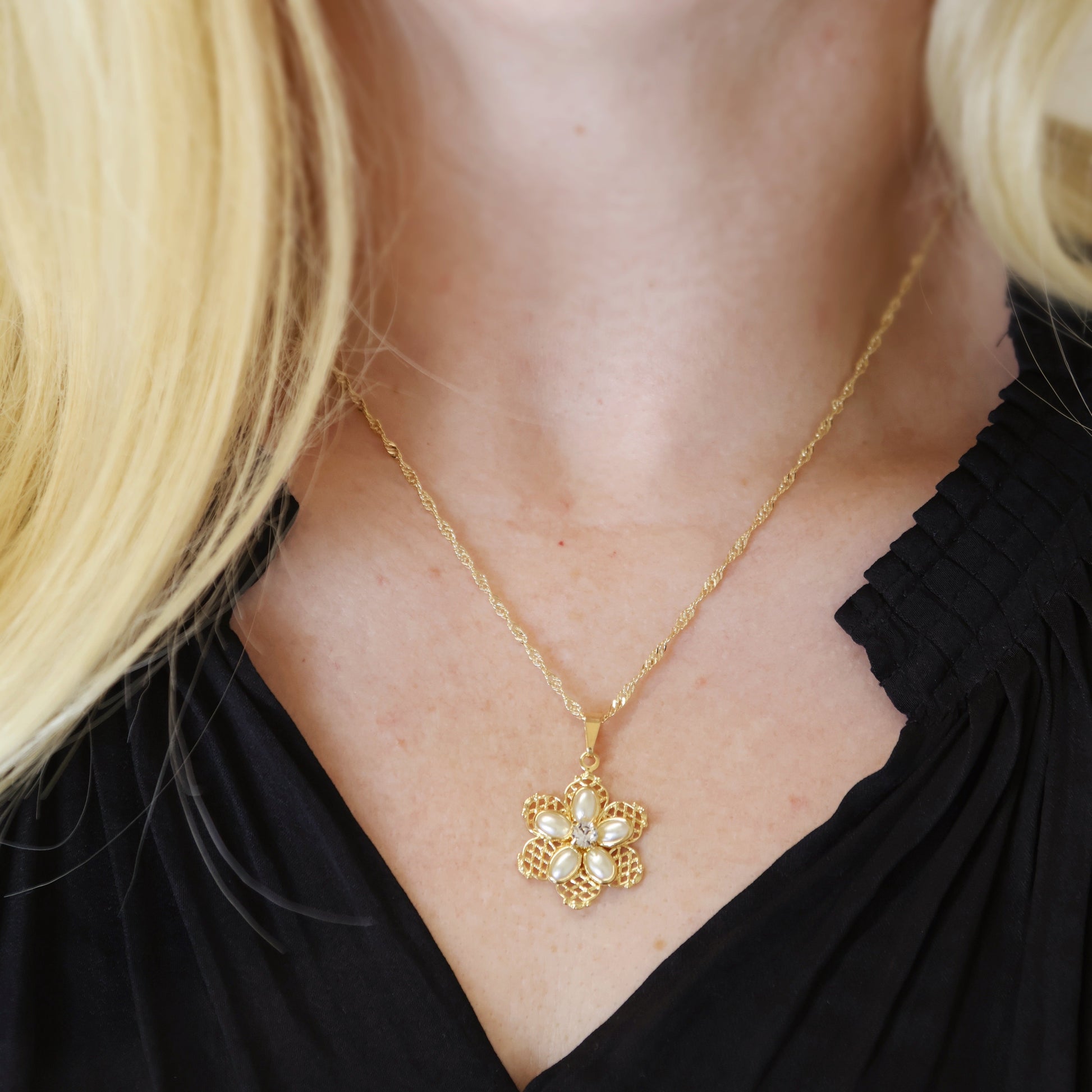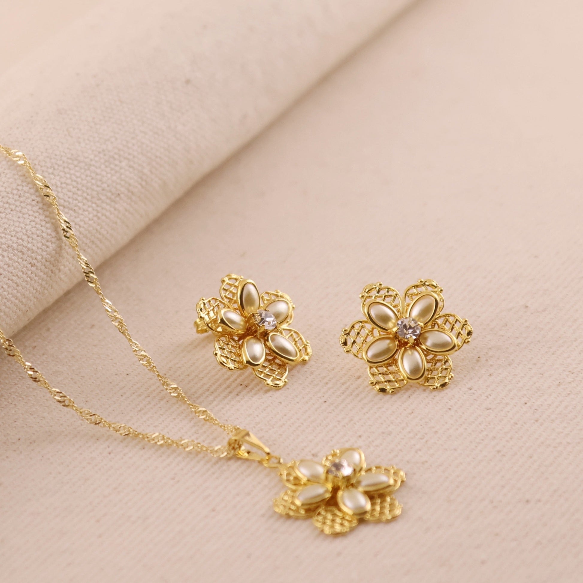 The necklace features delicate mesh flower blooms connected by fine gold filled links, resting gracefully along your collarbone. Each flower showcases meticulous craftsmanship with layered petals shaped pearls that create dimension and movement. The matching stud earrings echo this beautiful design.
