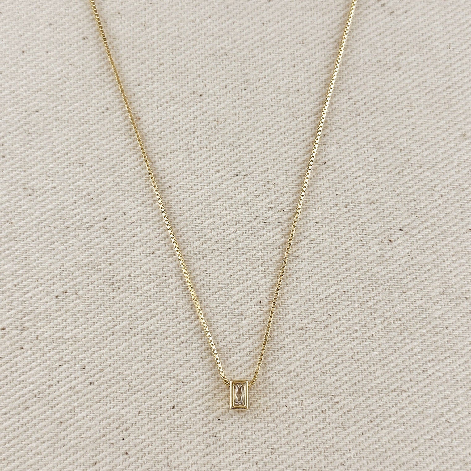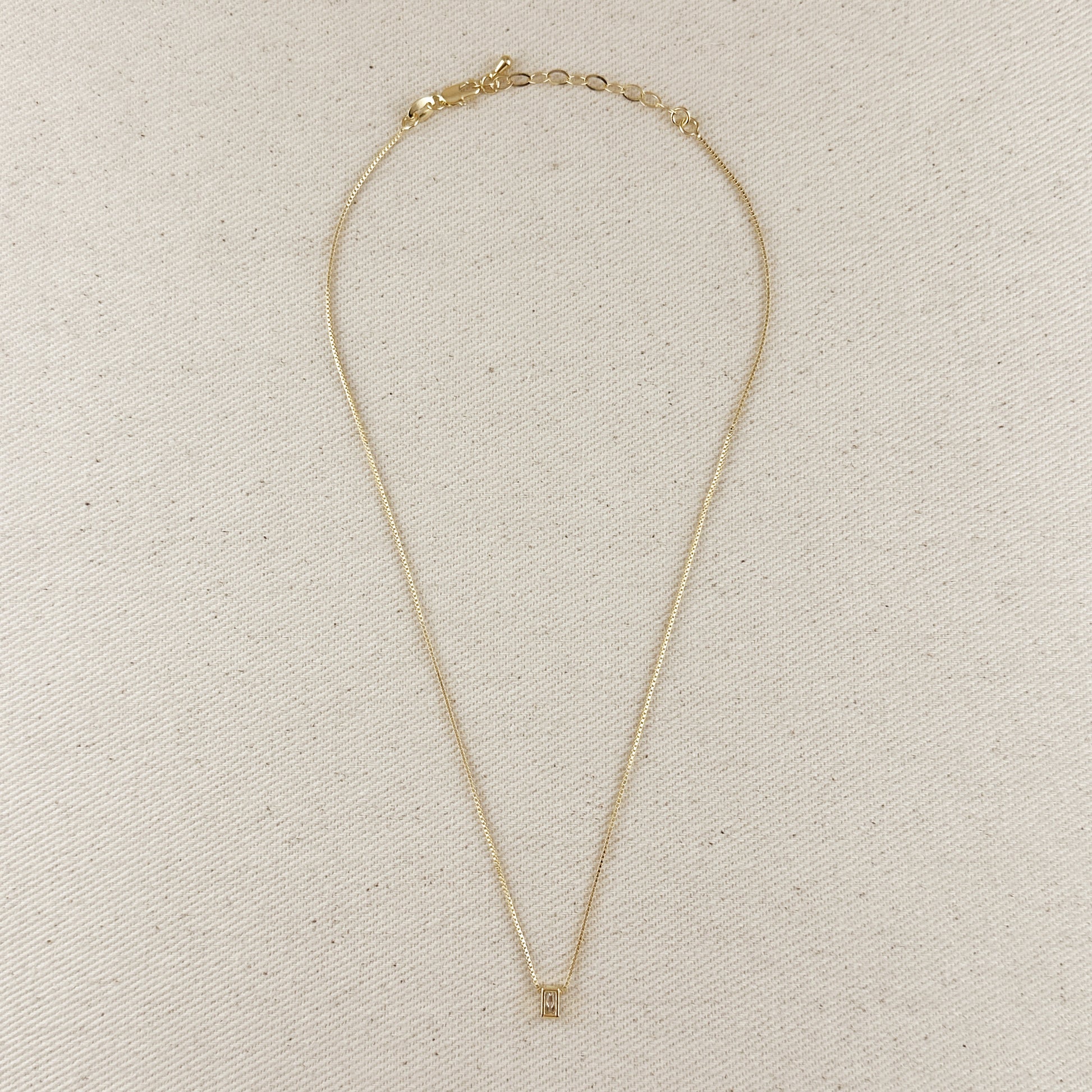 This elegant 18k Gold Filled Mini CZ Baguette Necklace combines modern sophistication with timeless appeal. The delicate pendant features a brilliant baguette-cut cubic zirconia stone that creates a subtle sparkle with every movement. The minimalist design makes it perfect for everyday wear, whether styled alone or layered with other necklaces for a personalized look.