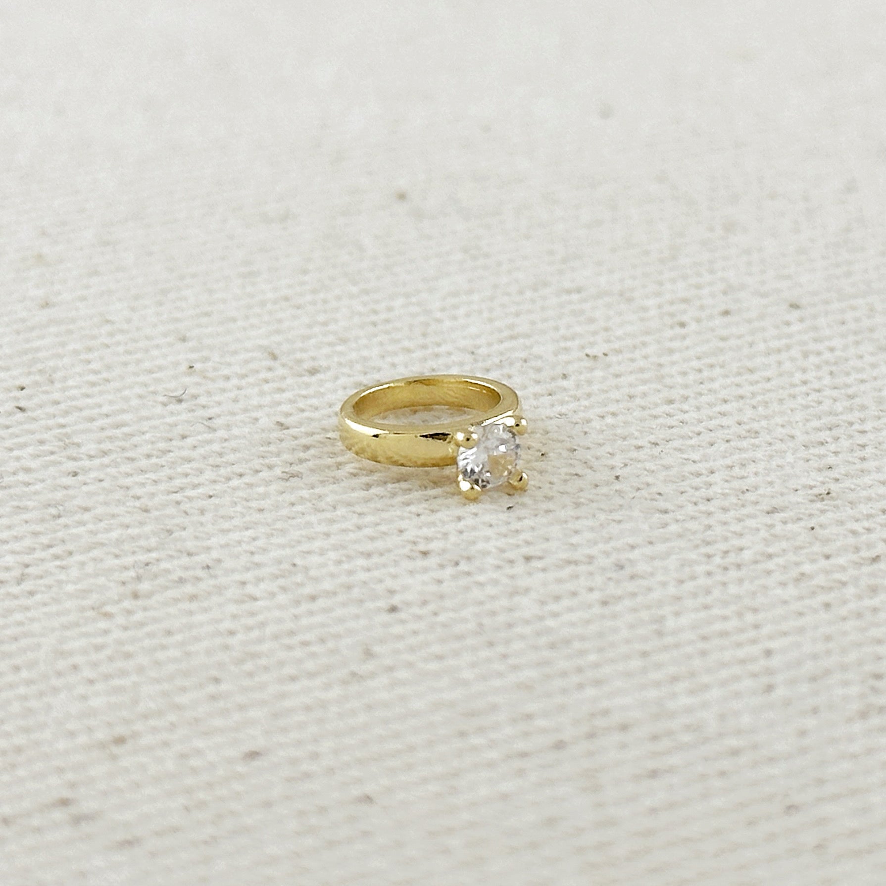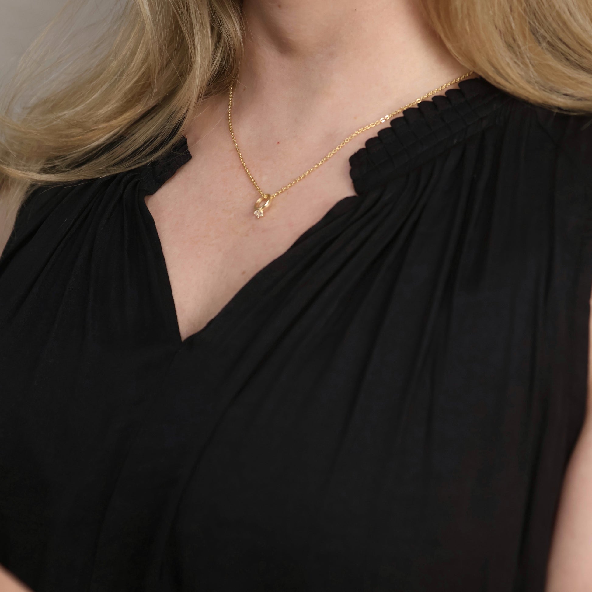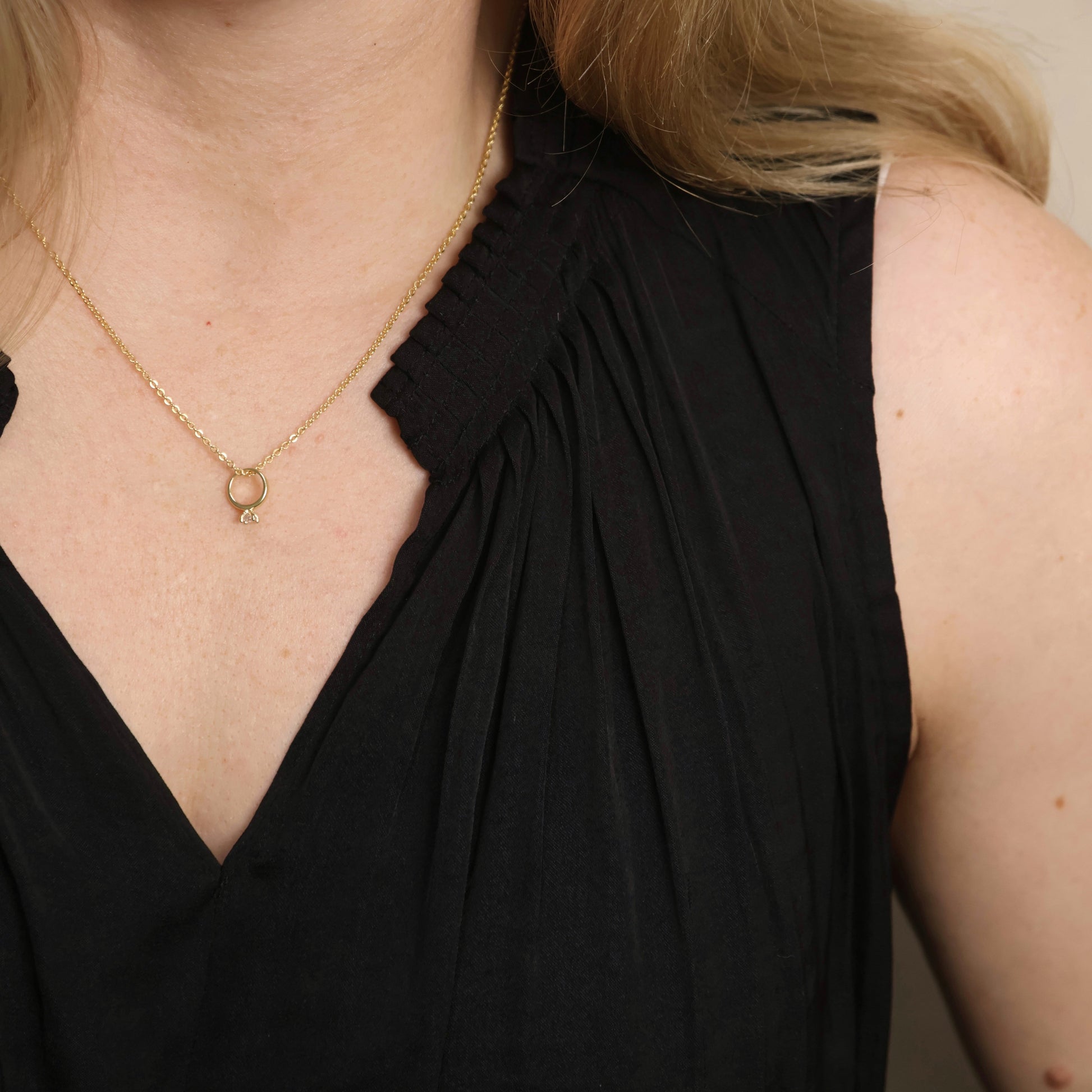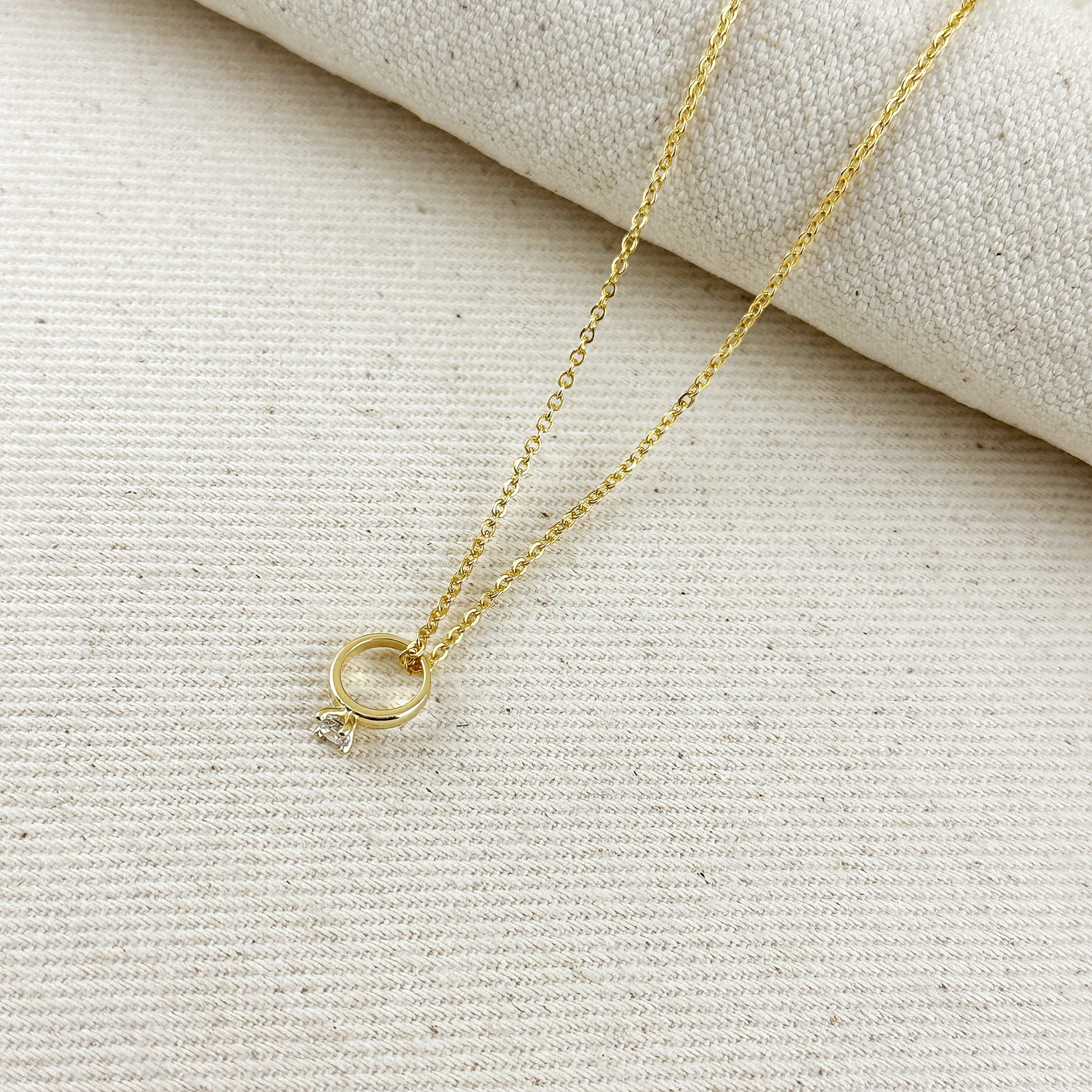 This delicate 18K gold filled pendant features a miniature diamond ring design, elegantly adorned with a sparkling CZ stone. The petite silhouette offers a subtle nod to romance and commitment while maintaining a contemporary aesthetic. Crafted with premium 18K gold filled material, this pendant provides the luxurious look of solid gold with enhanced durability for everyday wear. The brilliant cubic zirconia catches the light beautifully, adding a touch of sparkle to this meaningful piece. Perfect for layering with other necklaces or wearing as a standalone statement.