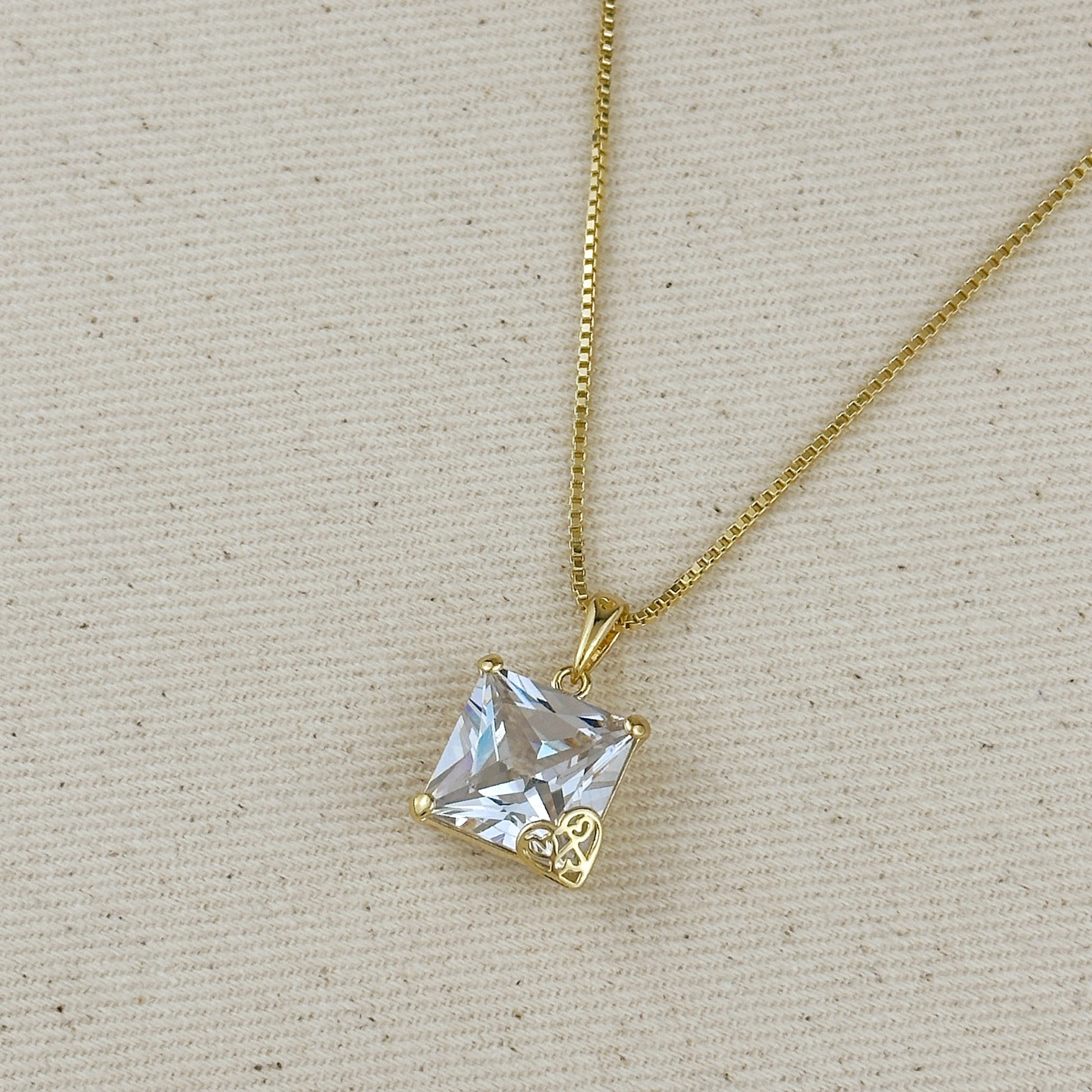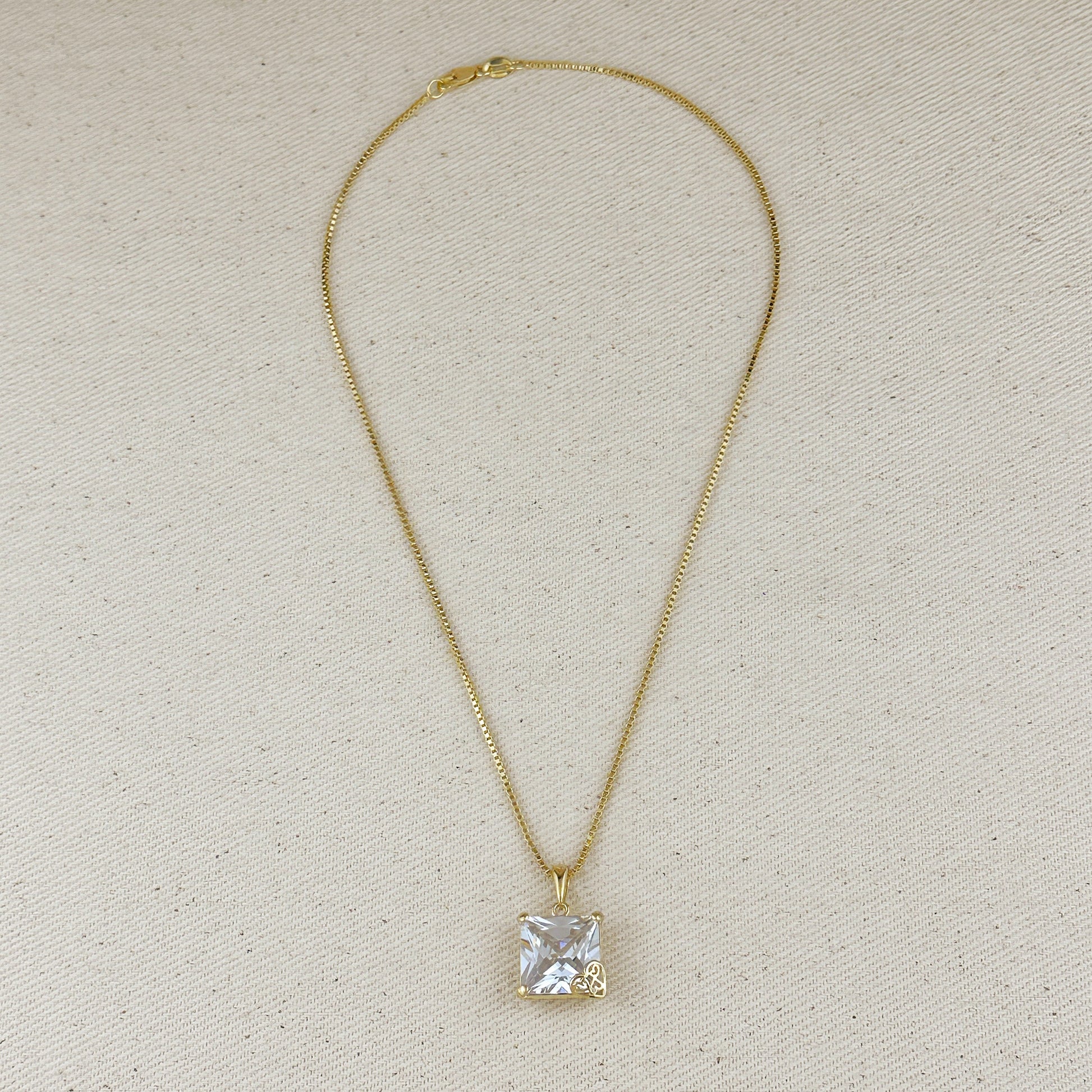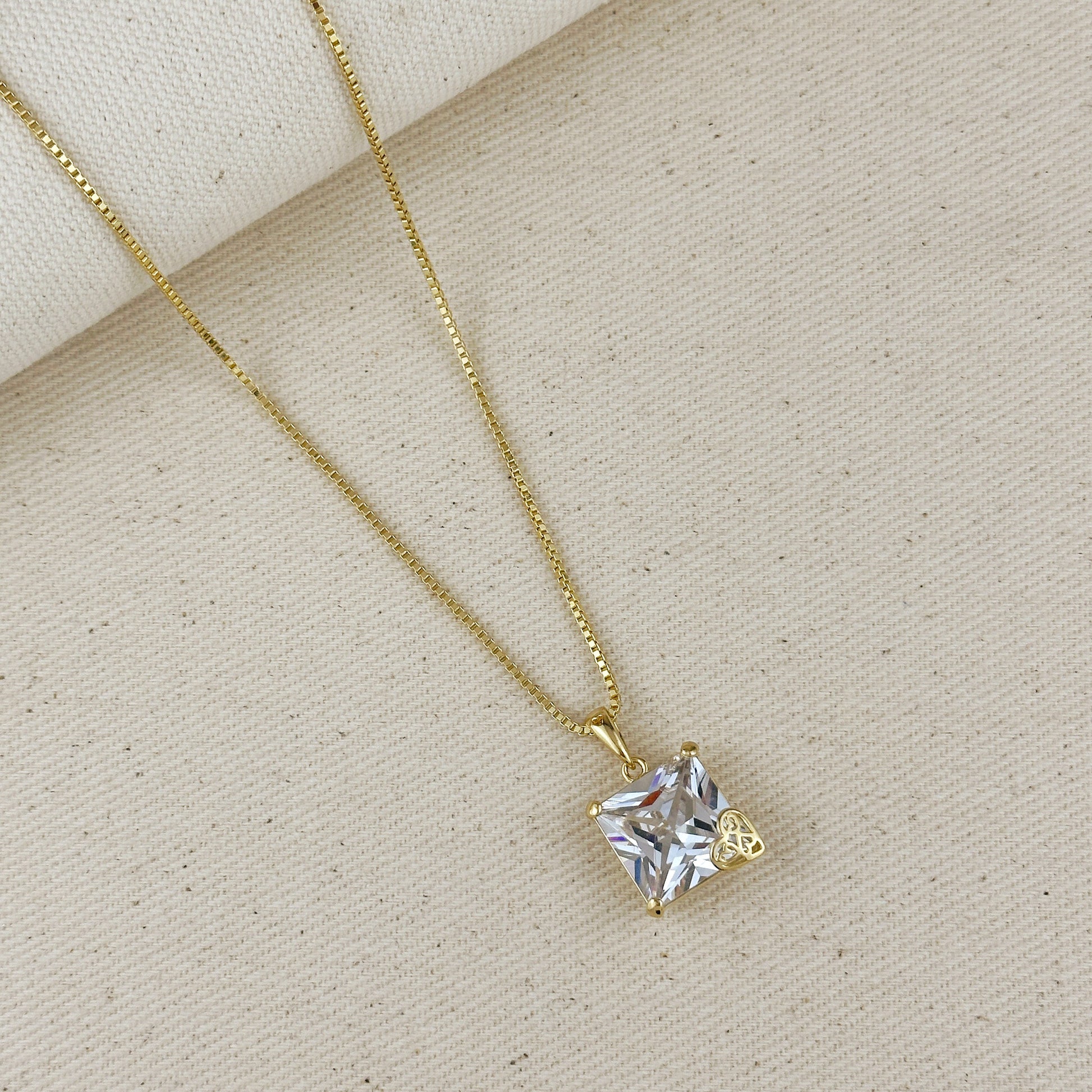 Make a bold statement with this eye-catching necklace featuring an oversized princess cut cubic zirconia stone. The brilliant square-cut centerpiece dangles elegantly from an 18k gold-filled chain, creating a perfect balance of glamour and sophistication.