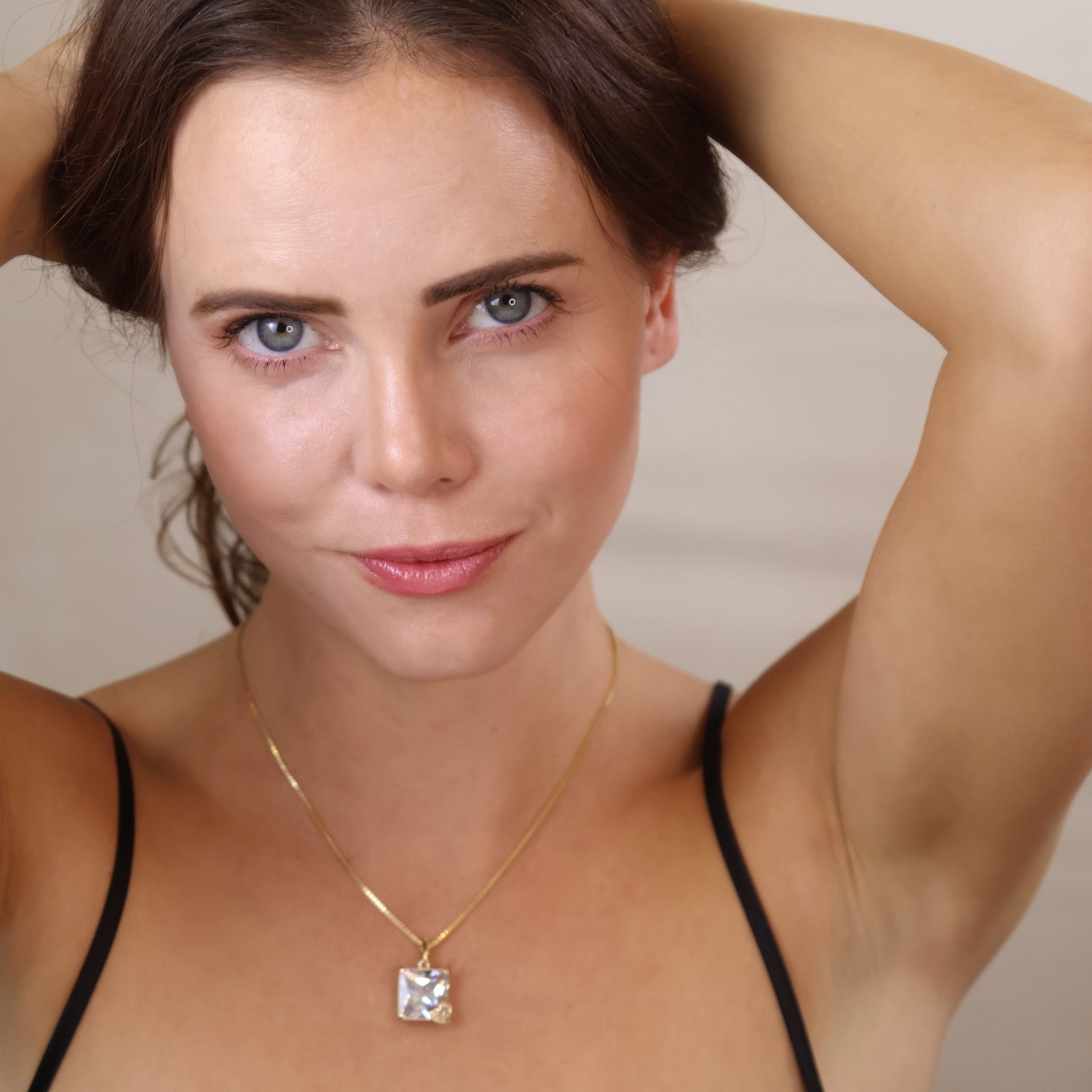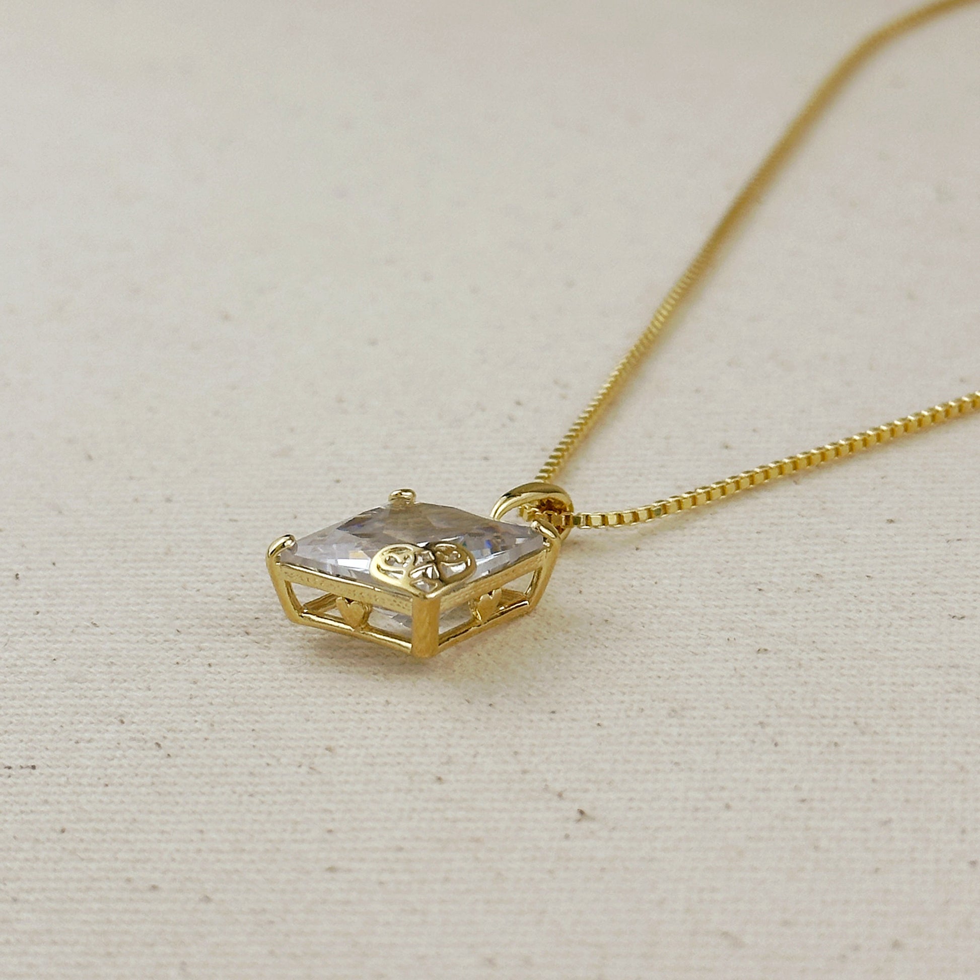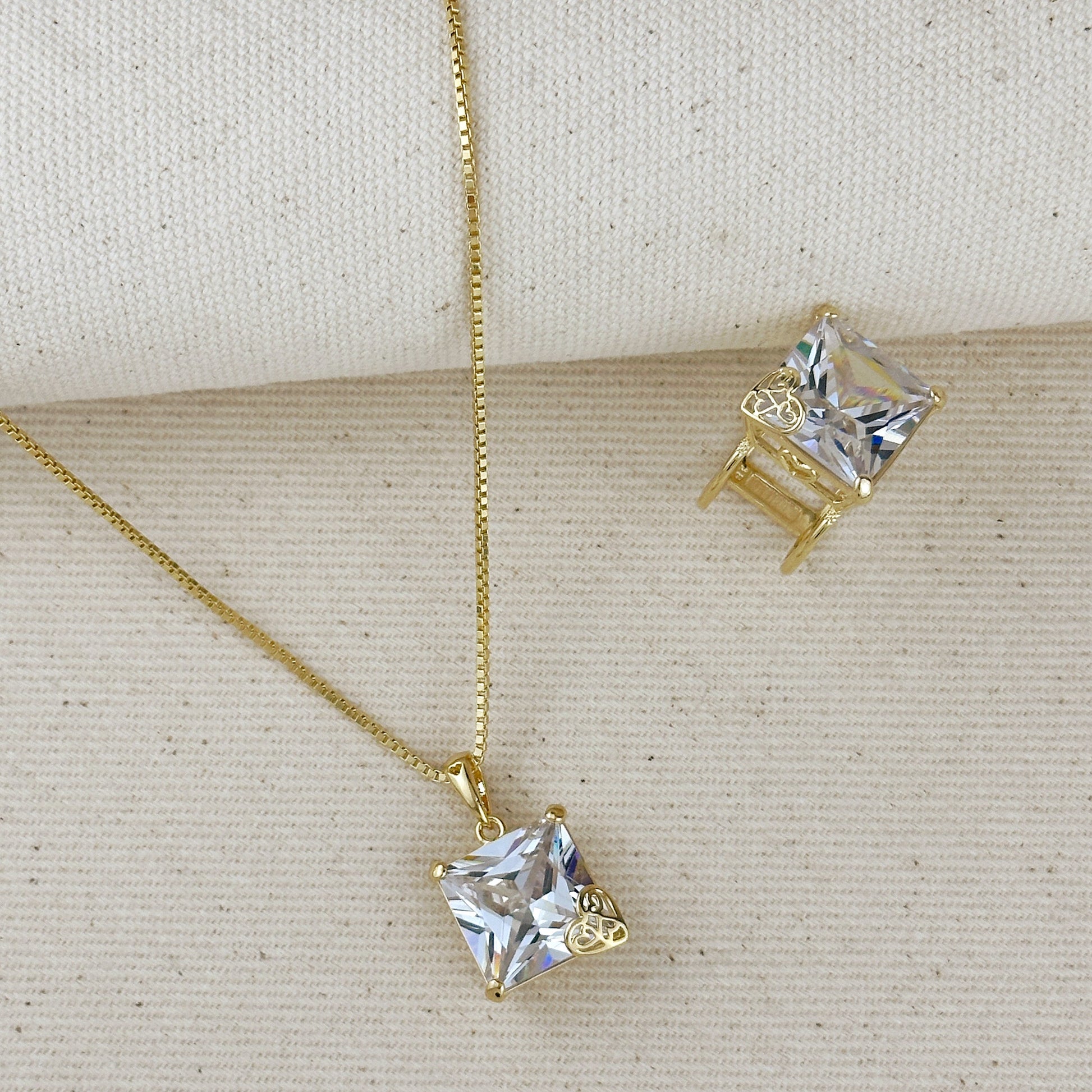 Make a bold statement with this eye-catching necklace featuring an oversized princess cut cubic zirconia stone. The brilliant square-cut centerpiece dangles elegantly from an 18k gold-filled chain, creating a perfect balance of glamour and sophistication.