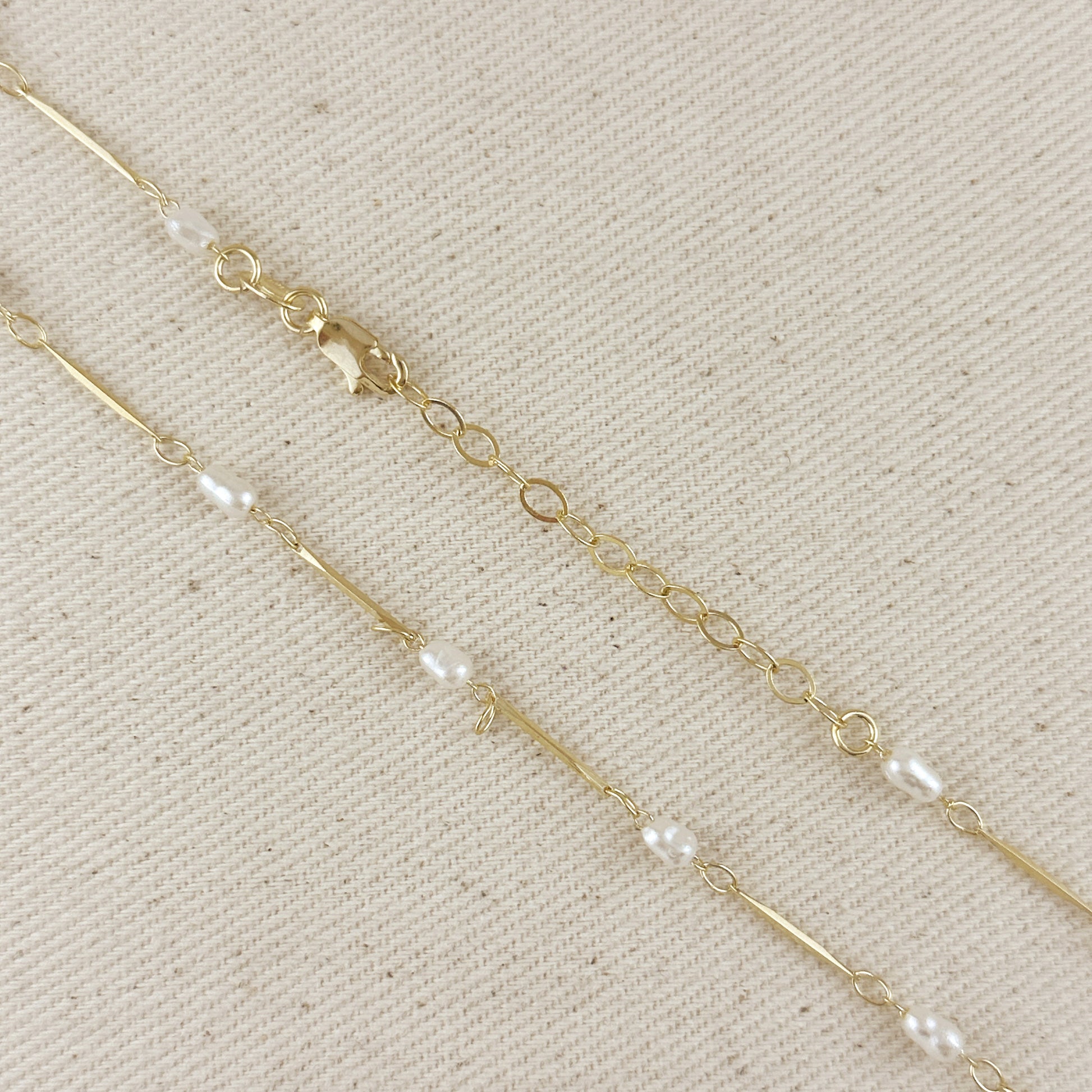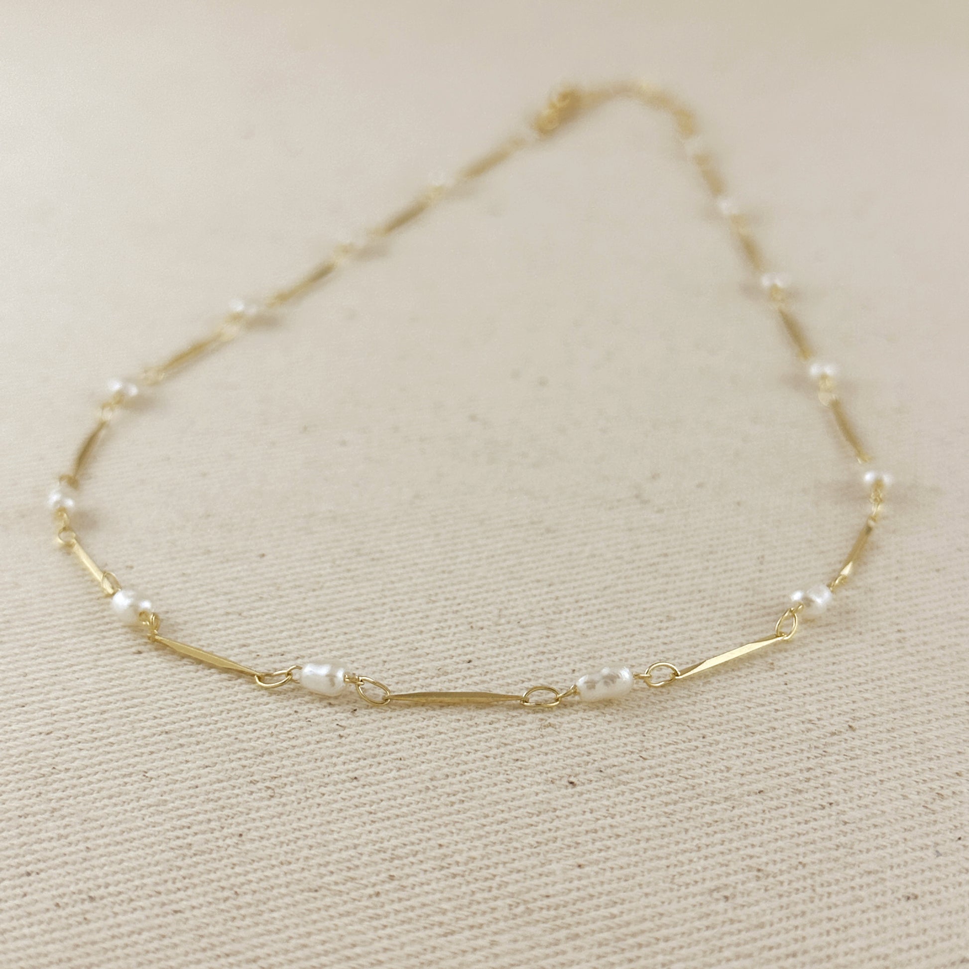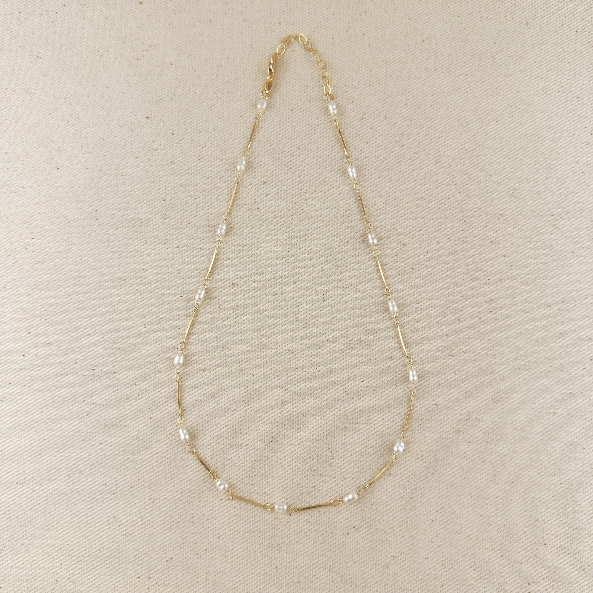 Elevate your neckline with our stunning 18K Gold Filled Pearl Bead & Straw Necklace. This sophisticated piece features the same exquisite craftsmanship, with luminous synthetic pearl beads alternating with slender gold-filled straw components for a balanced, elegant look.