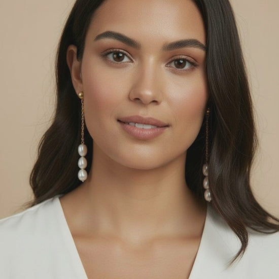 These gorgeous 3-inch statement earrings feature a row of lustrous baroque pearls that catch the light beautifully. The irregular pearl shapes create visual interest while maintaining classic elegance - perfect for the modern woman who wants to stand out.
