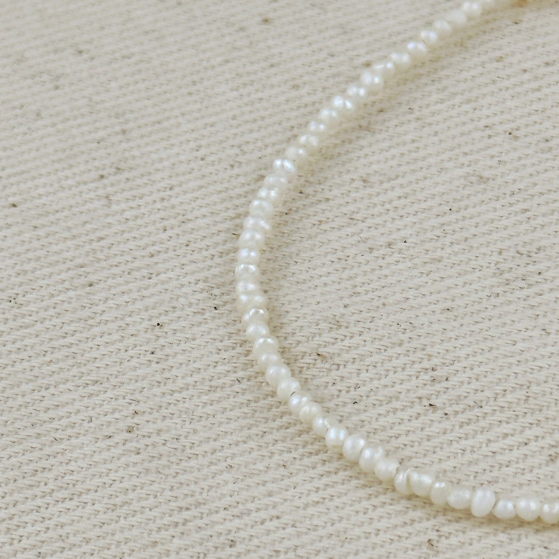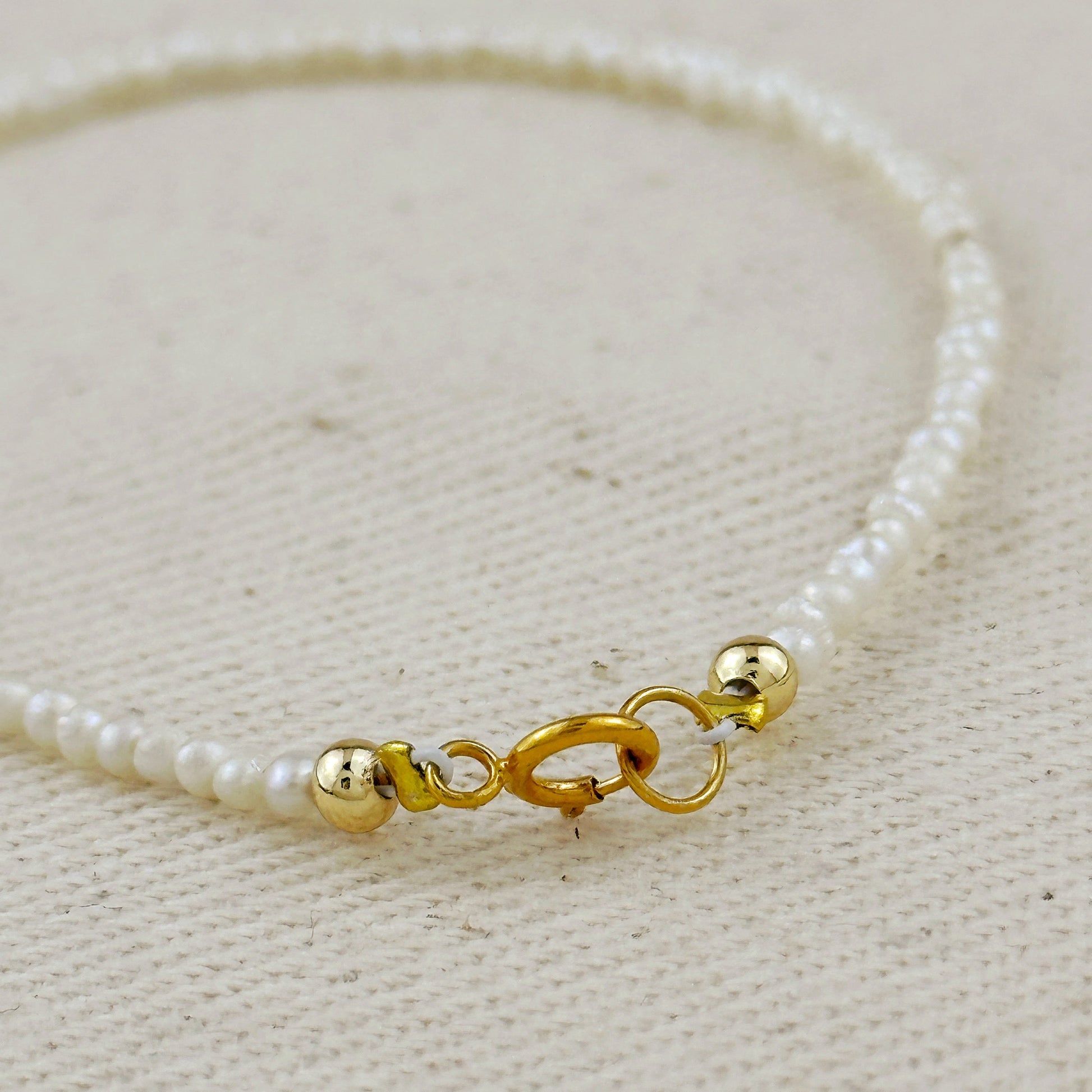 Tiny, lustrous freshwater pearls form a delicate strand, each pearl carefully chosen for its size, shape, and gleam. The 9k gold clasp and findings add a warm, luxurious touch, complementing the pearls' natural shimmer. This bracelet strikes the perfect balance between subtlety and sophistication, making it ideal for both daily wear and special events.