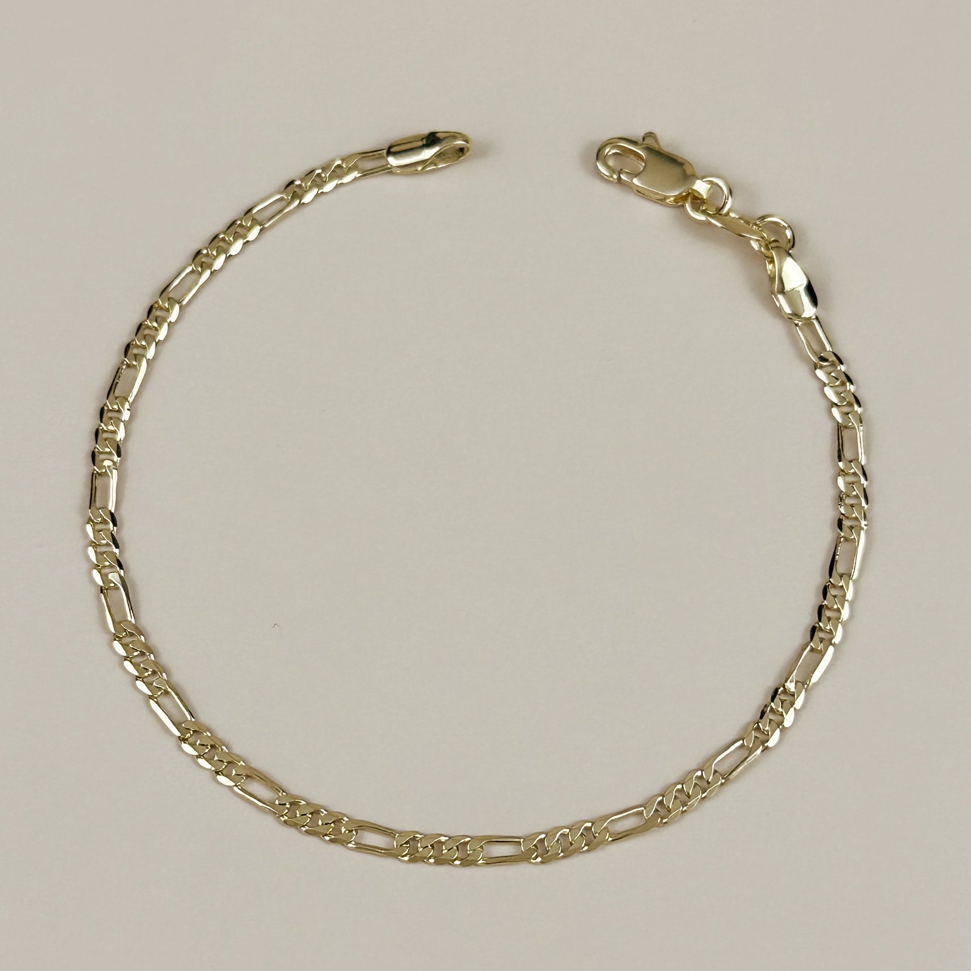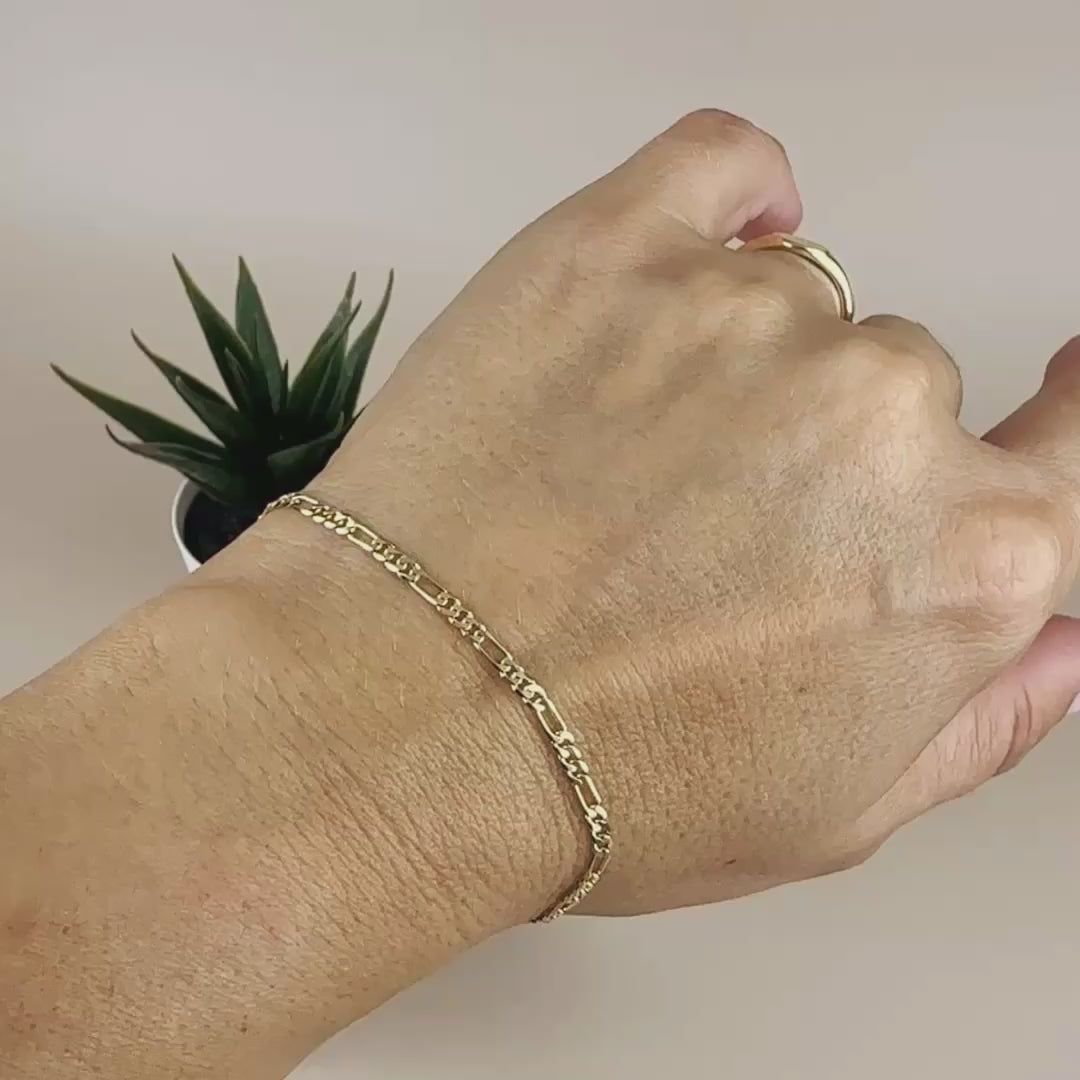 This versatile Figaro chain bracelet pairs beautifully with both casual and formal attire. Wear it solo for classic elegance or layer with other gold bracelets for a modern stacked look. The flat chain design catches light beautifully, adding subtle sparkle to your wrist.