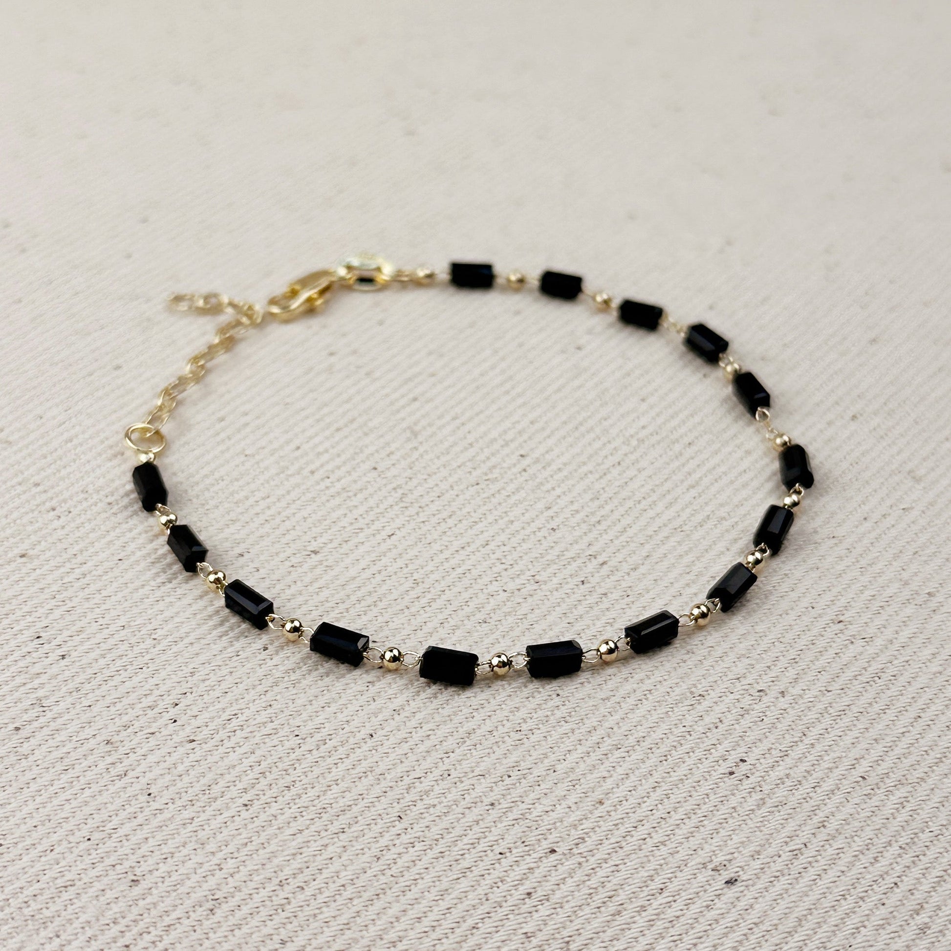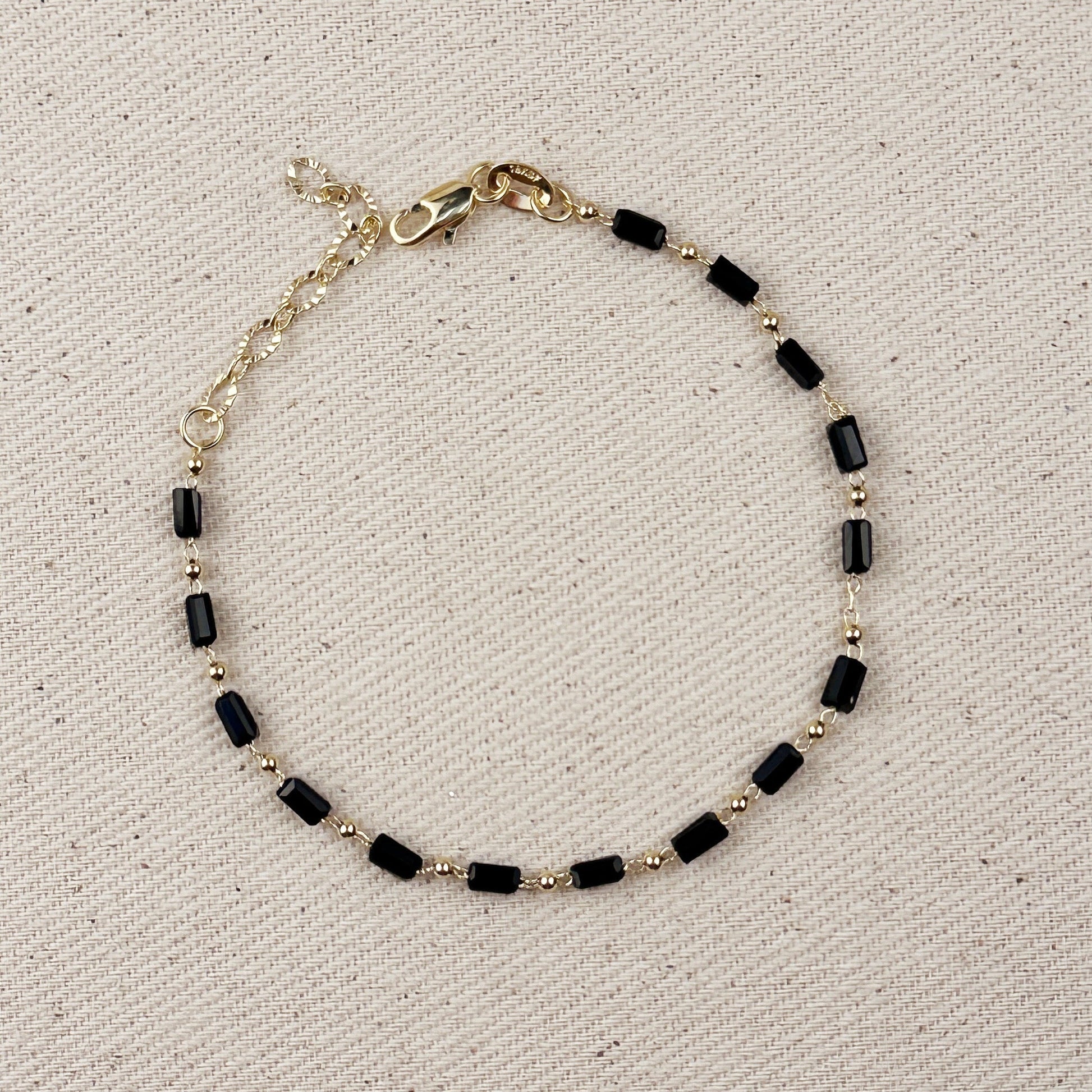 Transform your summer style with this adorable black baguette bead bracelet featuring chic 2mm black acrylic beads and luxurious 18K gold-filled construction. Perfect for adding a touch of fun sophistication to any warm-weather outfit.