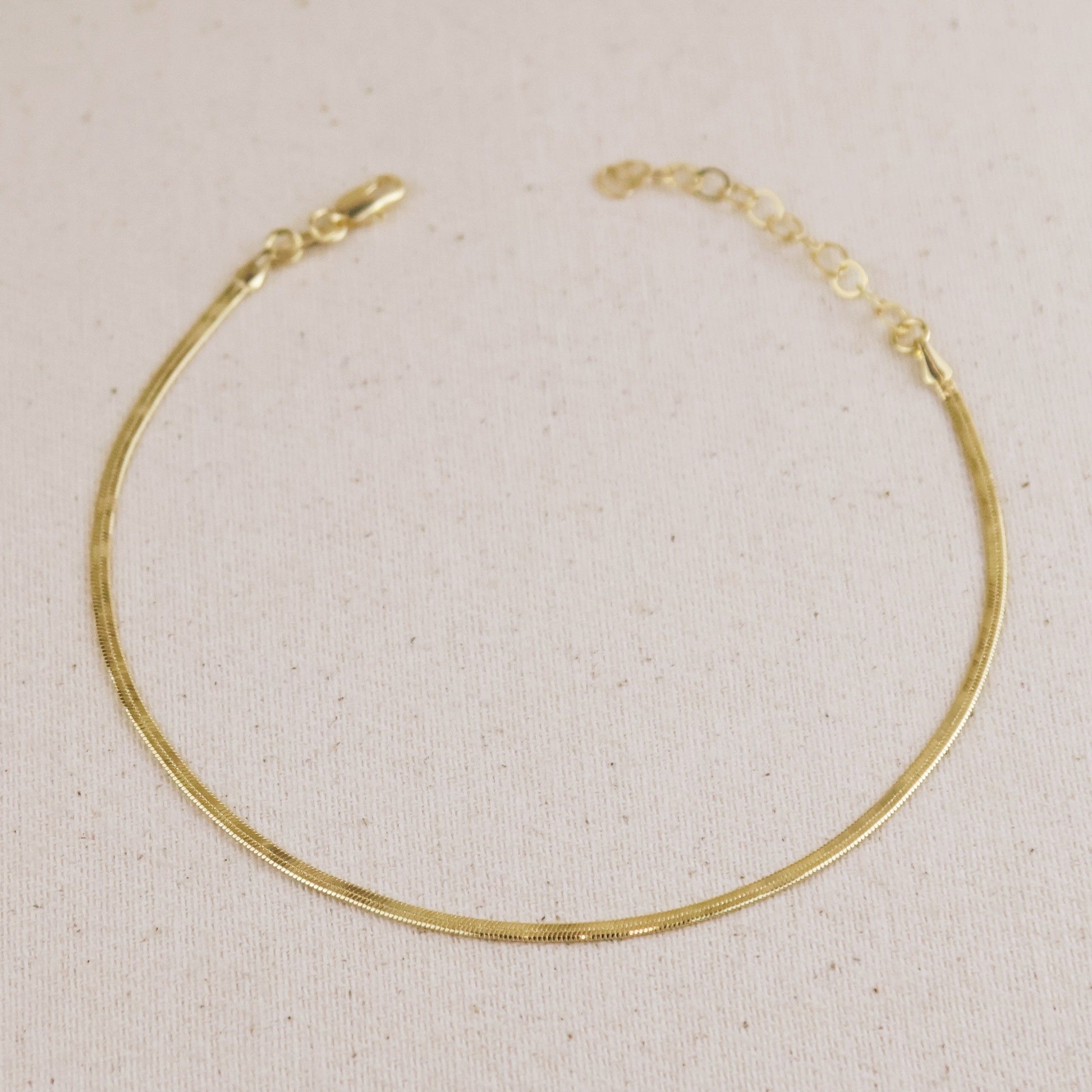 Sleek and sophisticated, this 18k gold filled anklet features a classic 2mm herringbone chain. The smooth, flat design lies comfortably against the skin, offering a subtle shimmer with every step. Durable and tarnish-resistant, it's perfect for everyday wear or beach outings. This versatile anklet adds a touch of elegance to any outfit, from casual to dressy.