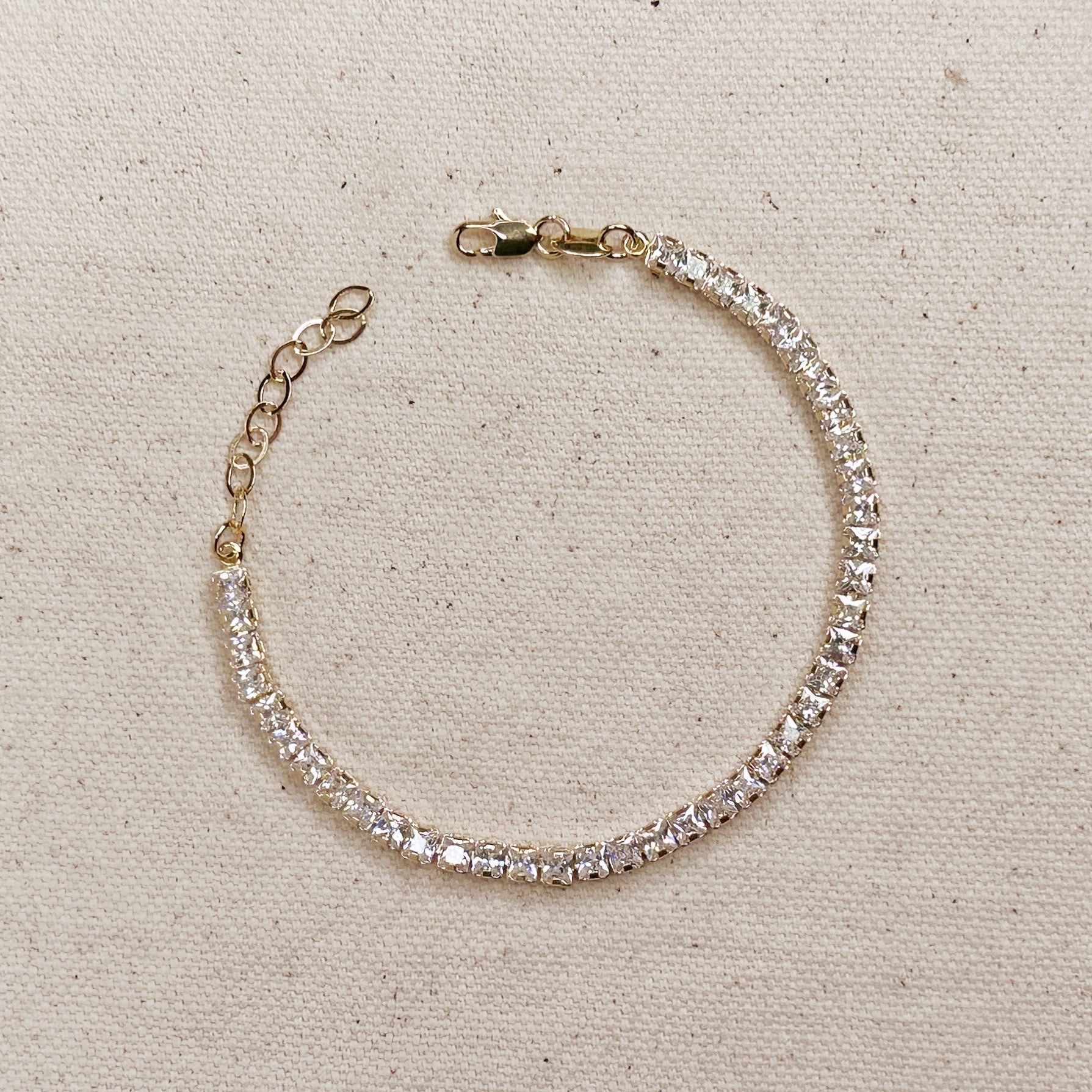 Make every outfit sparkle with this stunning 18K gold filled tennis bracelet featuring brilliant cubic zirconia stones that catch the light from every angle. The ultimate luxury accessory that adds instant glamour to any look.