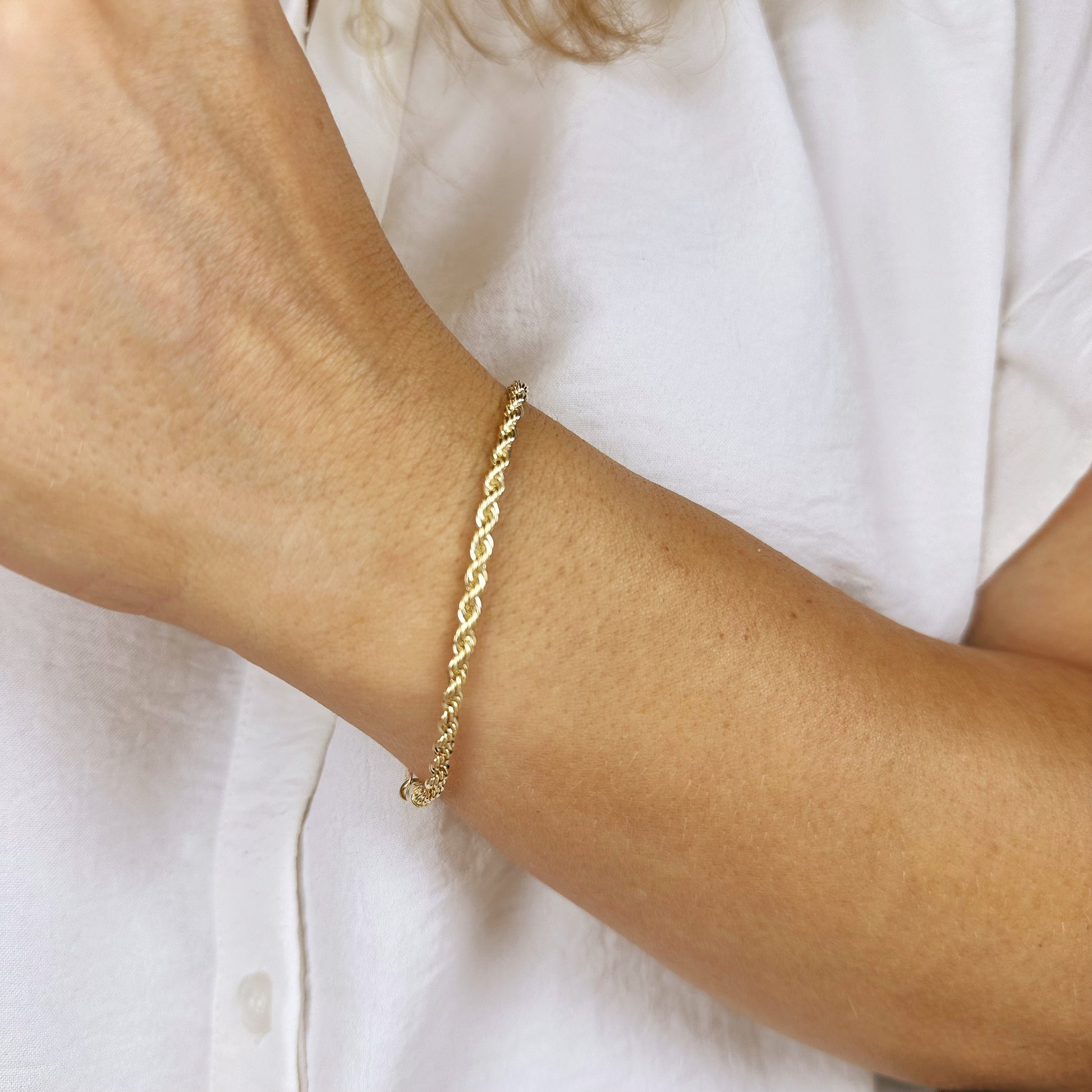 Meet your new favorite bracelet - the perfect blend of elegance and simplicity. This gorgeous 18K gold filled rope bracelet is designed for the modern woman who appreciates timeless style without the fuss. At just 3mm wide, it's delicate enough to wear alone or stack beautifully with your other favorite pieces.
