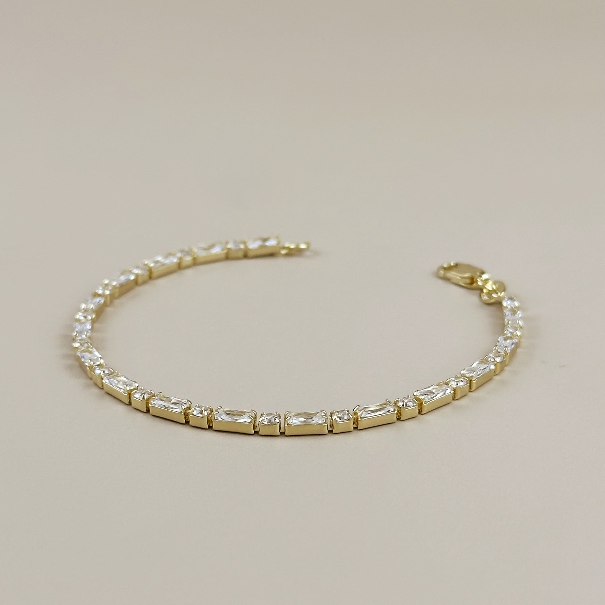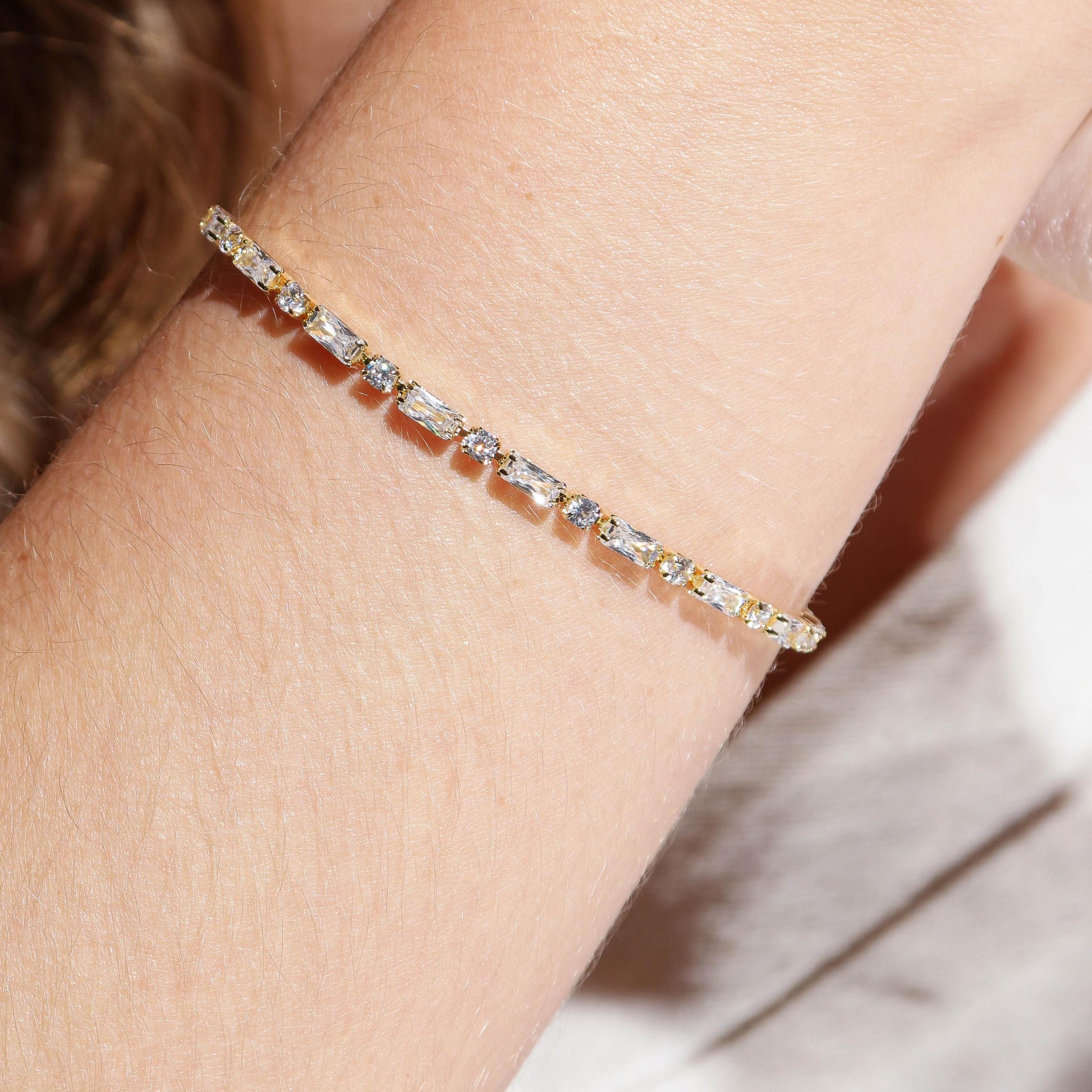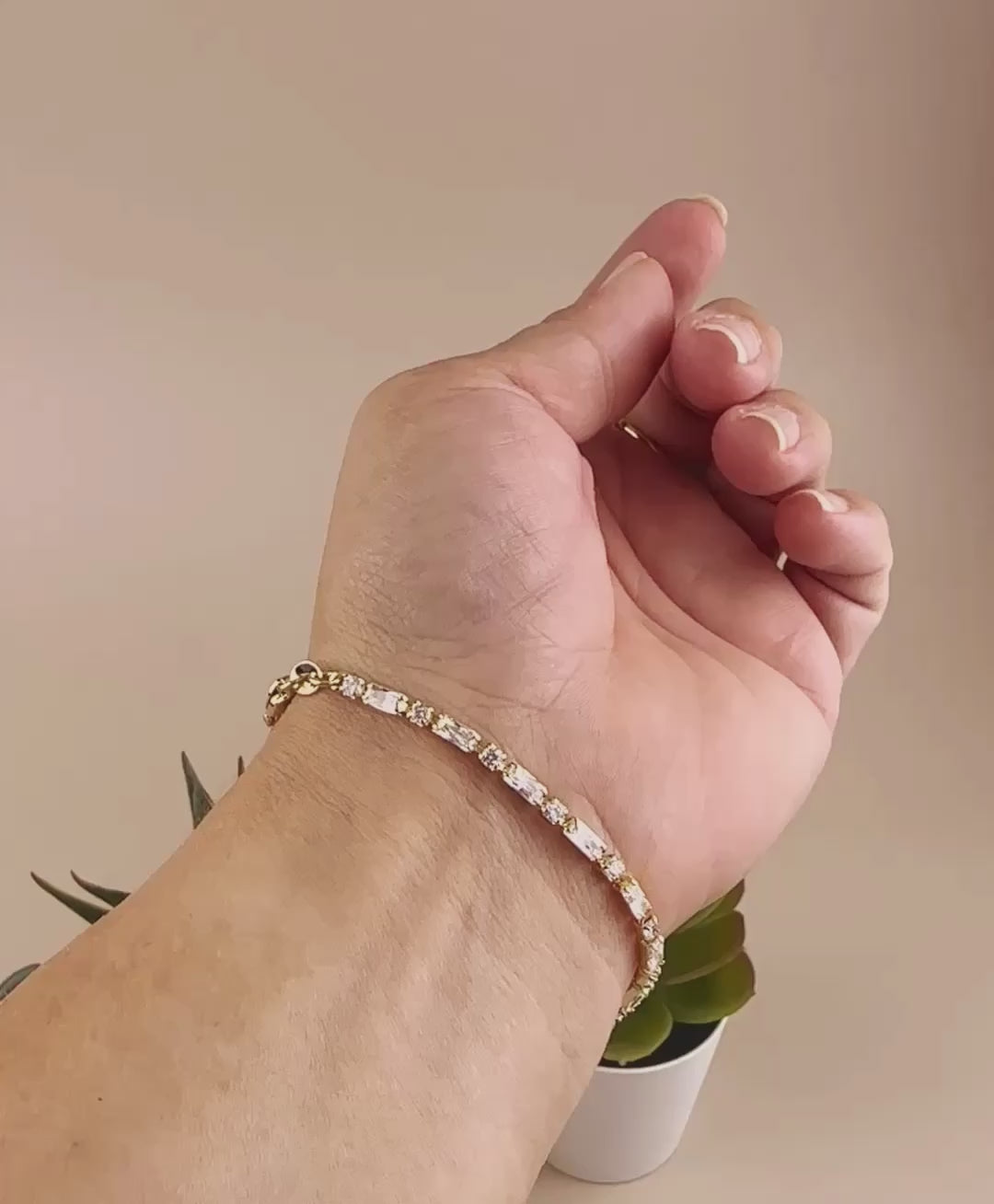 Keywords: tennis bracelet, 18k gold filled bracelet, cubic zirconia tennis bracelet, CZ tennis bracelet, delicate tennis bracelet, baguette cut bracelet, mixed cut tennis bracelet, AAAAA cubic zirconia, luxury bracelet, sparkle bracelet, bridal bracelet, elegant bracelet