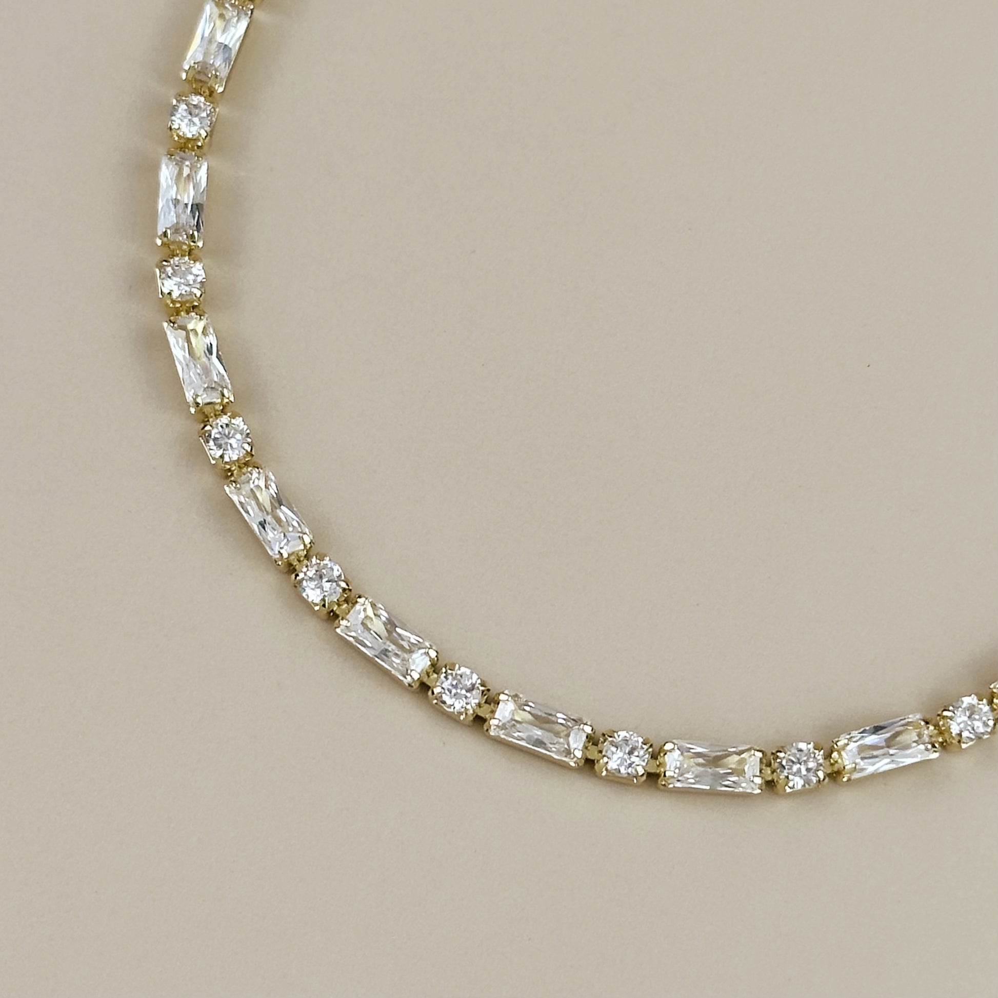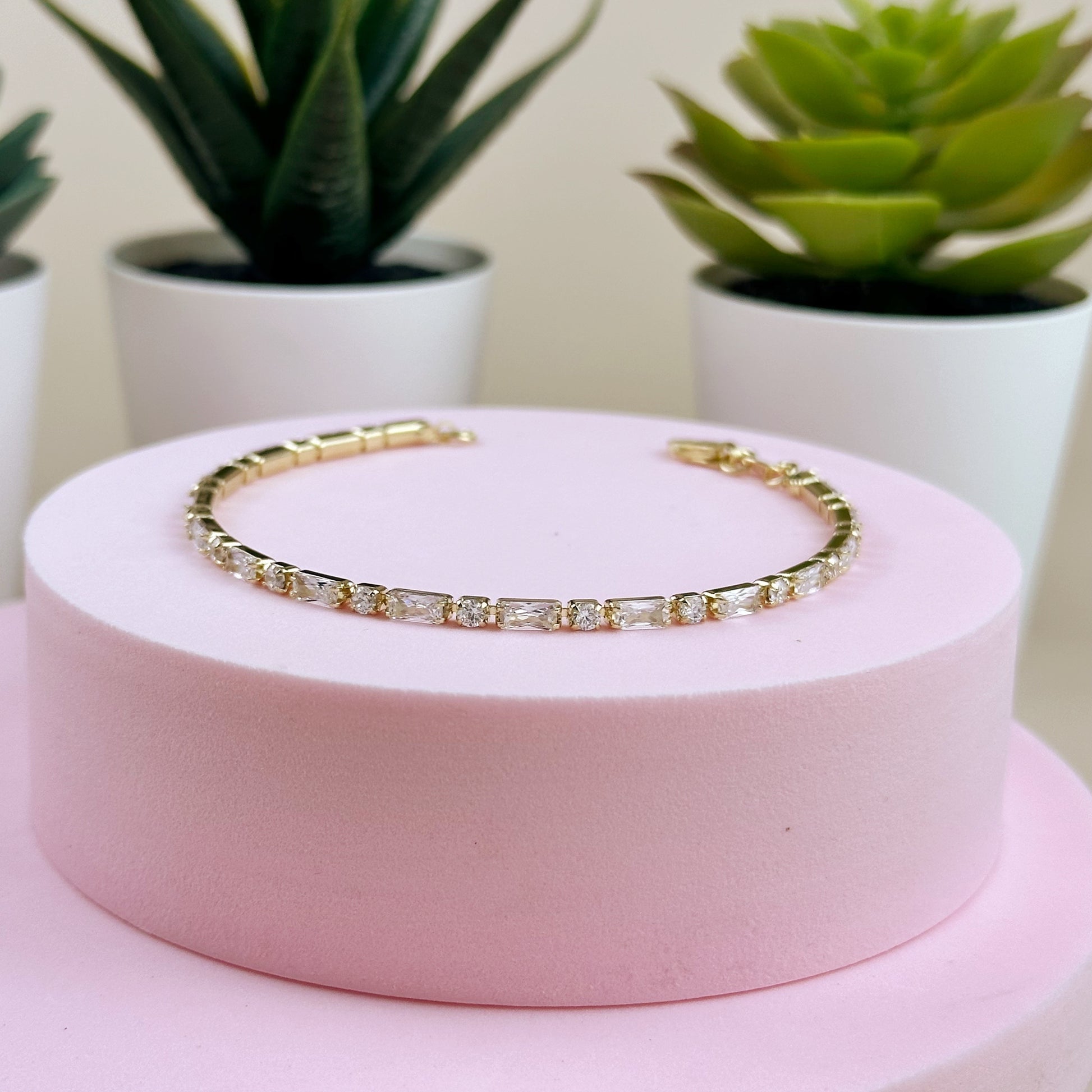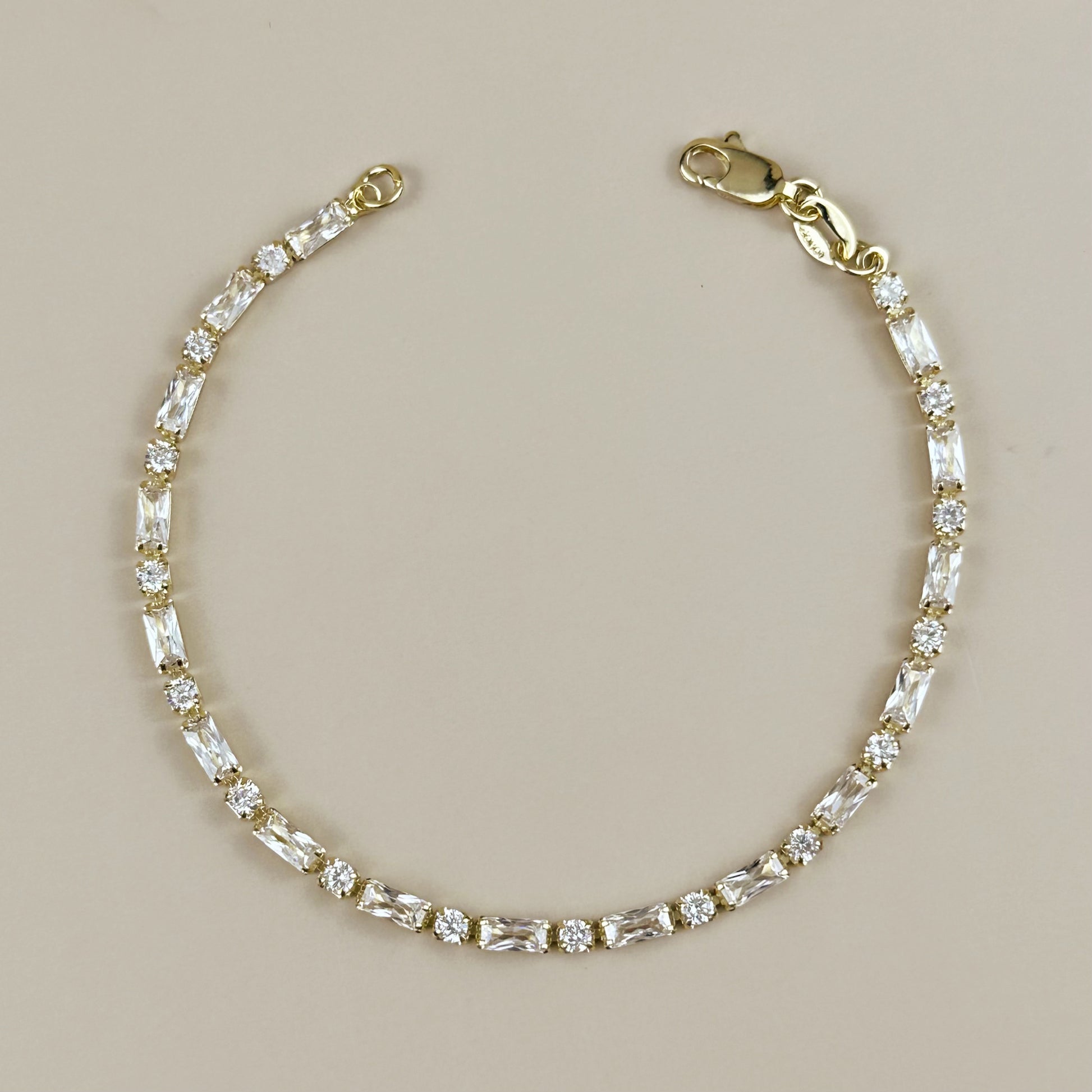 Keywords: tennis bracelet, 18k gold filled bracelet, cubic zirconia tennis bracelet, CZ tennis bracelet, delicate tennis bracelet, baguette cut bracelet, mixed cut tennis bracelet, AAAAA cubic zirconia, luxury bracelet, sparkle bracelet, bridal bracelet, elegant bracelet