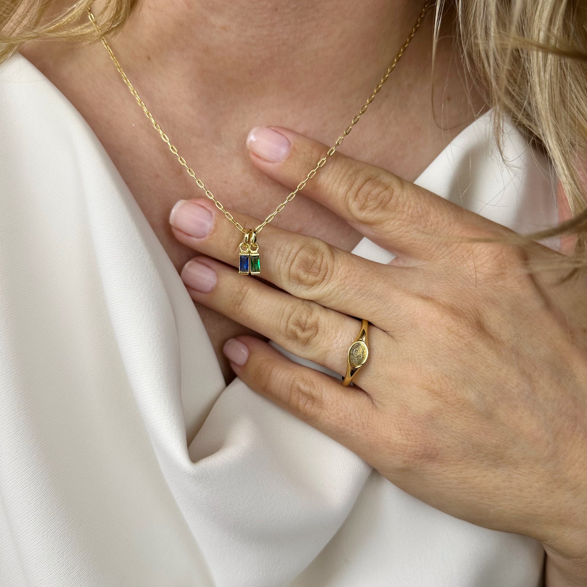 This stunning baguette pendant showcases high-quality colored cubic zirconia stones that beautifully represent each birth month. The elegant baguette cut maximizes brilliance and color saturation, creating a sophisticated birthstone charm that captures light beautifully and adds personalized meaning to any necklace.