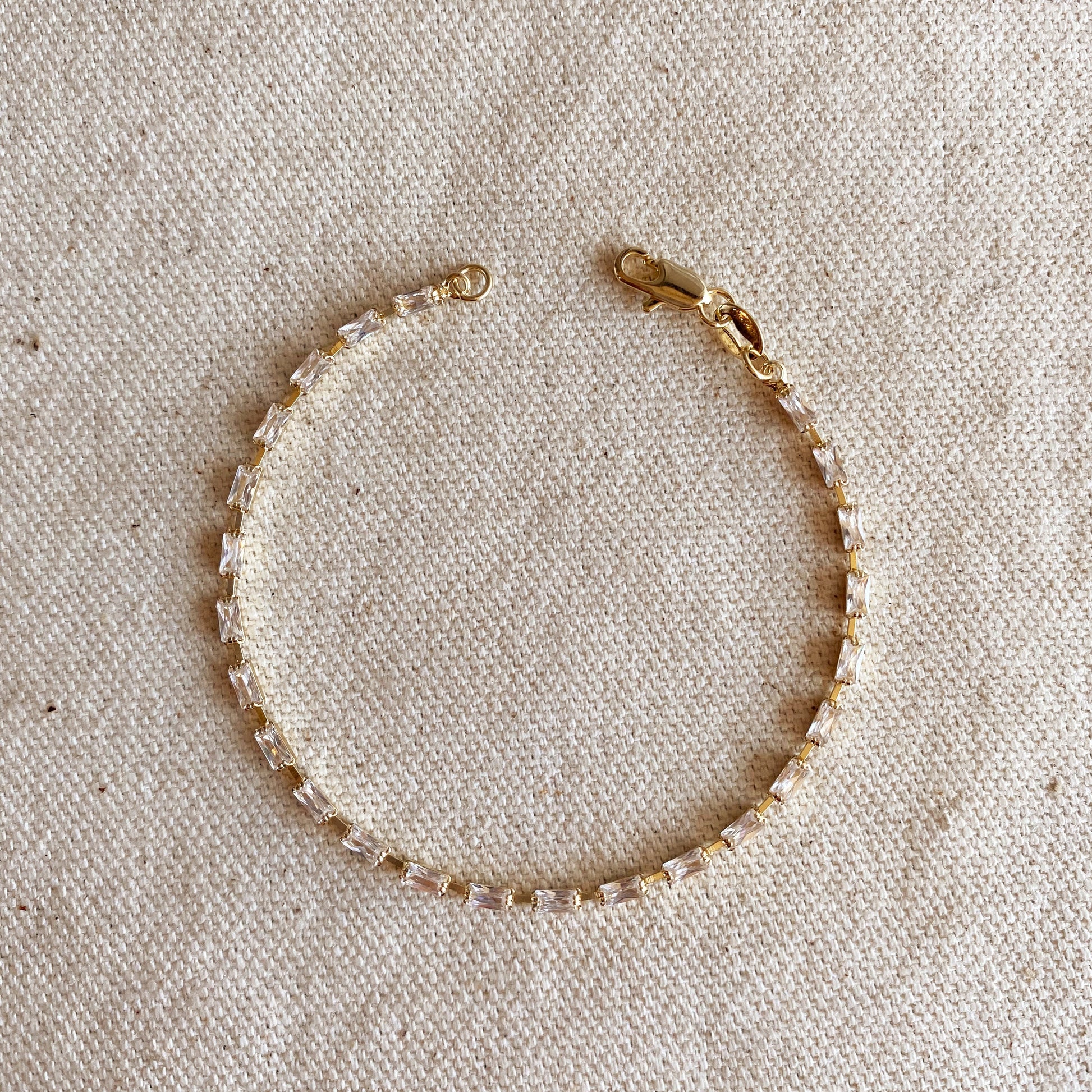 Elevate your jewelry collection with this exquisite 18K gold filled tennis bracelet featuring stunning baguette cut cubic zirconia stones. This women's luxury bracelet combines timeless elegance with modern sophistication, making it the perfect accessory for any occasion.