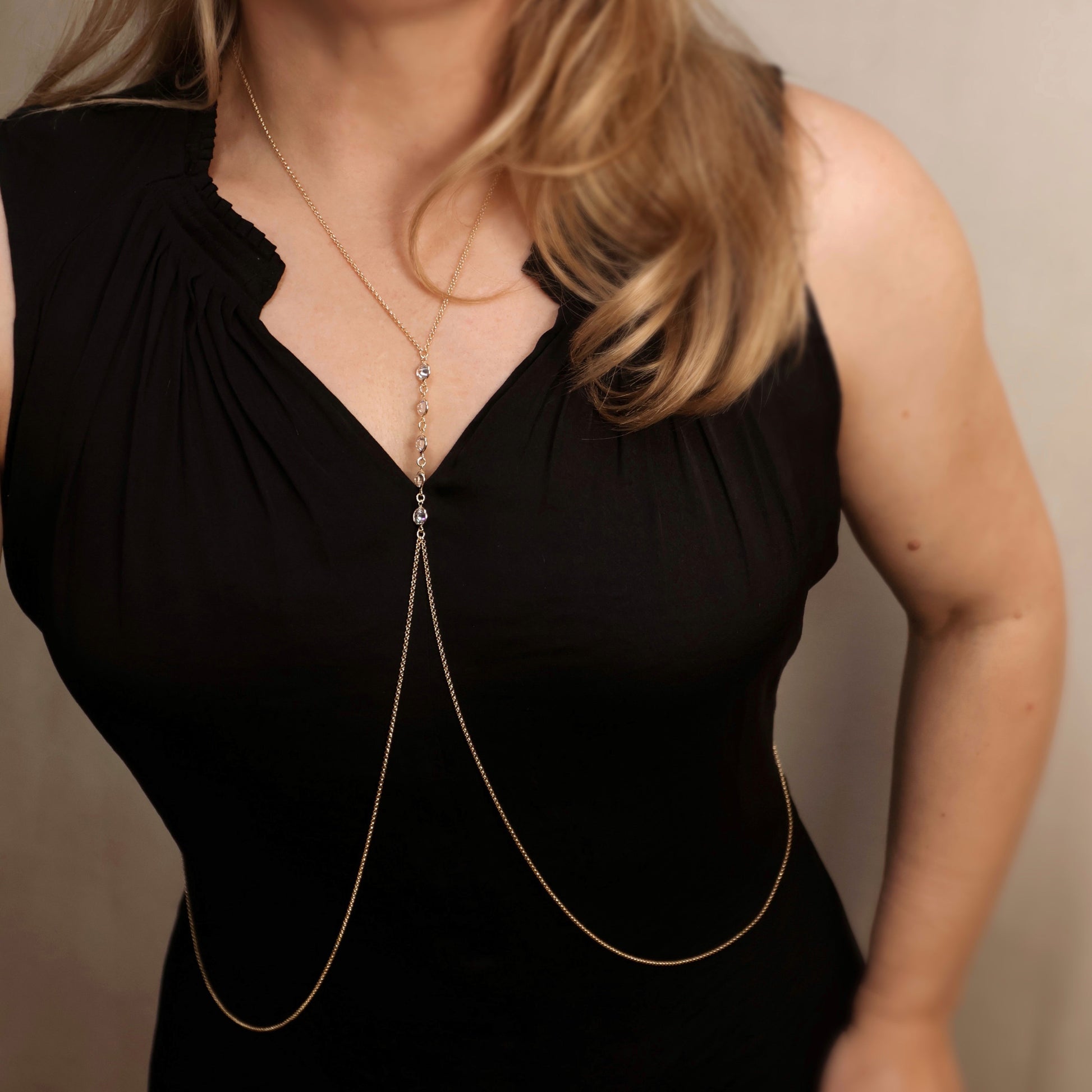 This luxurious 18K gold filled body chain features elegant bezel-set CZ stones that catch the light with every movement. Delicately crafted for a lightweight feel against the skin, this versatile piece drapes beautifully to accentuate your silhouette. The premium gold filled construction offers the opulent look of solid gold with enhanced durability for lasting wear. The sparkling cubic zirconia stones in secure bezel settings add a touch of glamour while maintaining a sophisticated aesthetic. Perfect for elevating swimwear, creating a stunning layered look over clothing, or adding an unexpected element to evening attire. A statement accessory that effortlessly transitions from beach days to night out.