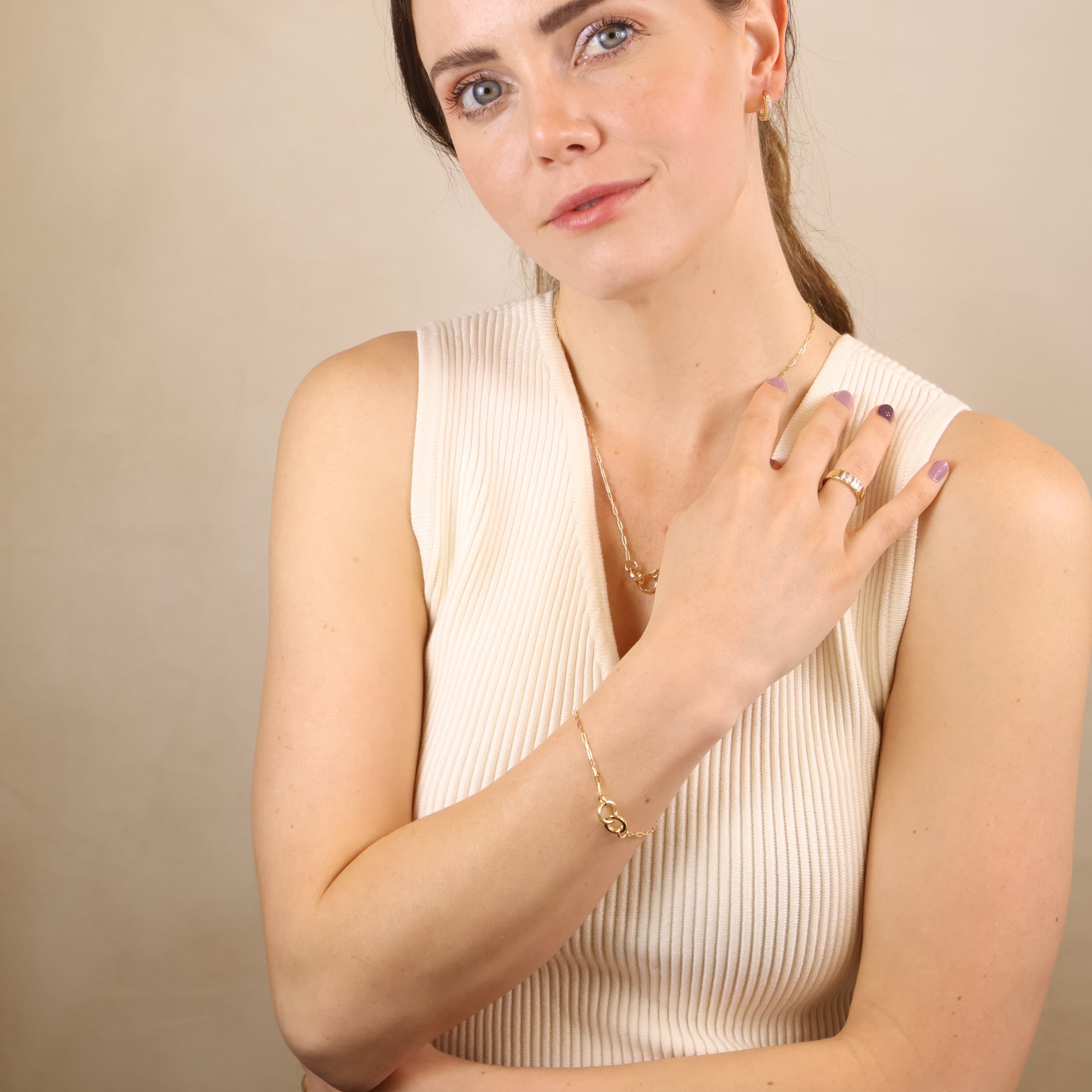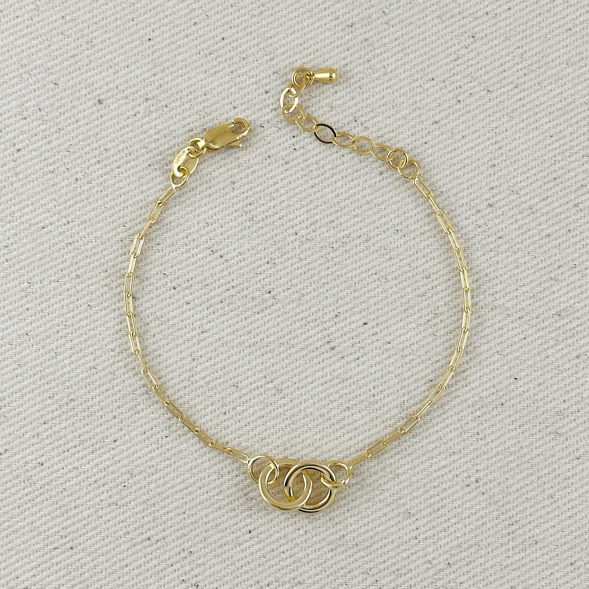 Adorn your wrist with our exquisite 18k Gold Filled Linked Bracelet. This elegant piece showcases a stunning centerpiece of two harmoniously connected circles brilliantly polished to perfection for a sophisticated contrast.