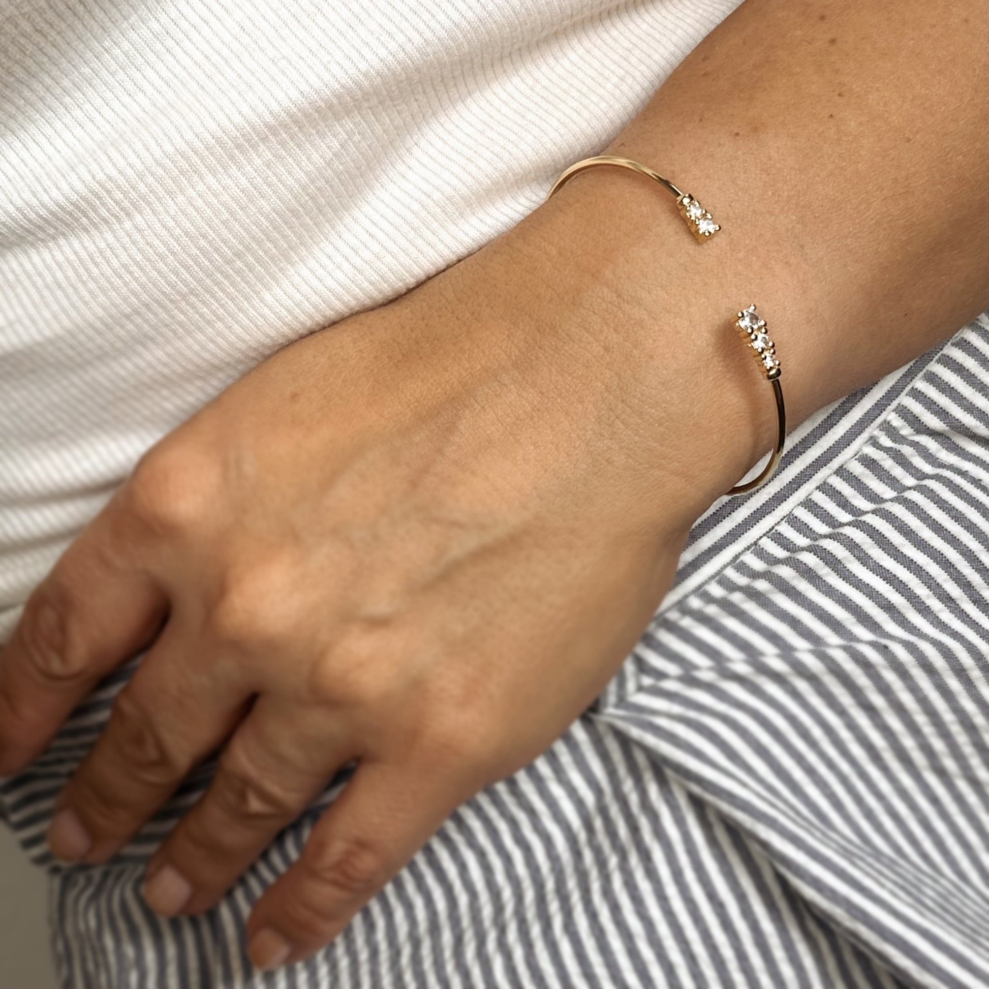 Elevate your style with this stunning 18k gold filled open cuff bracelet featuring sparkling cubic zirconia stones - sophisticated elegance for any occasion.