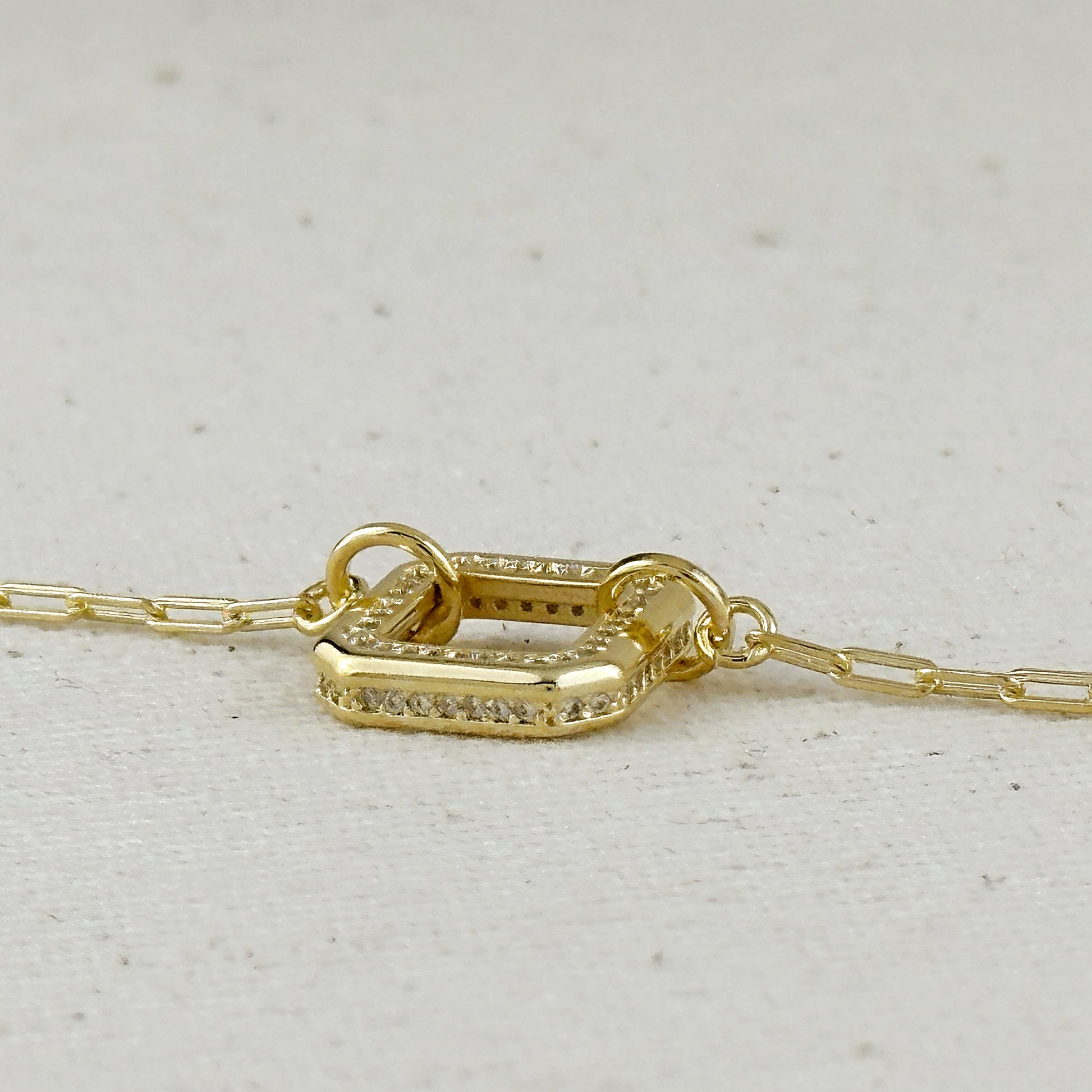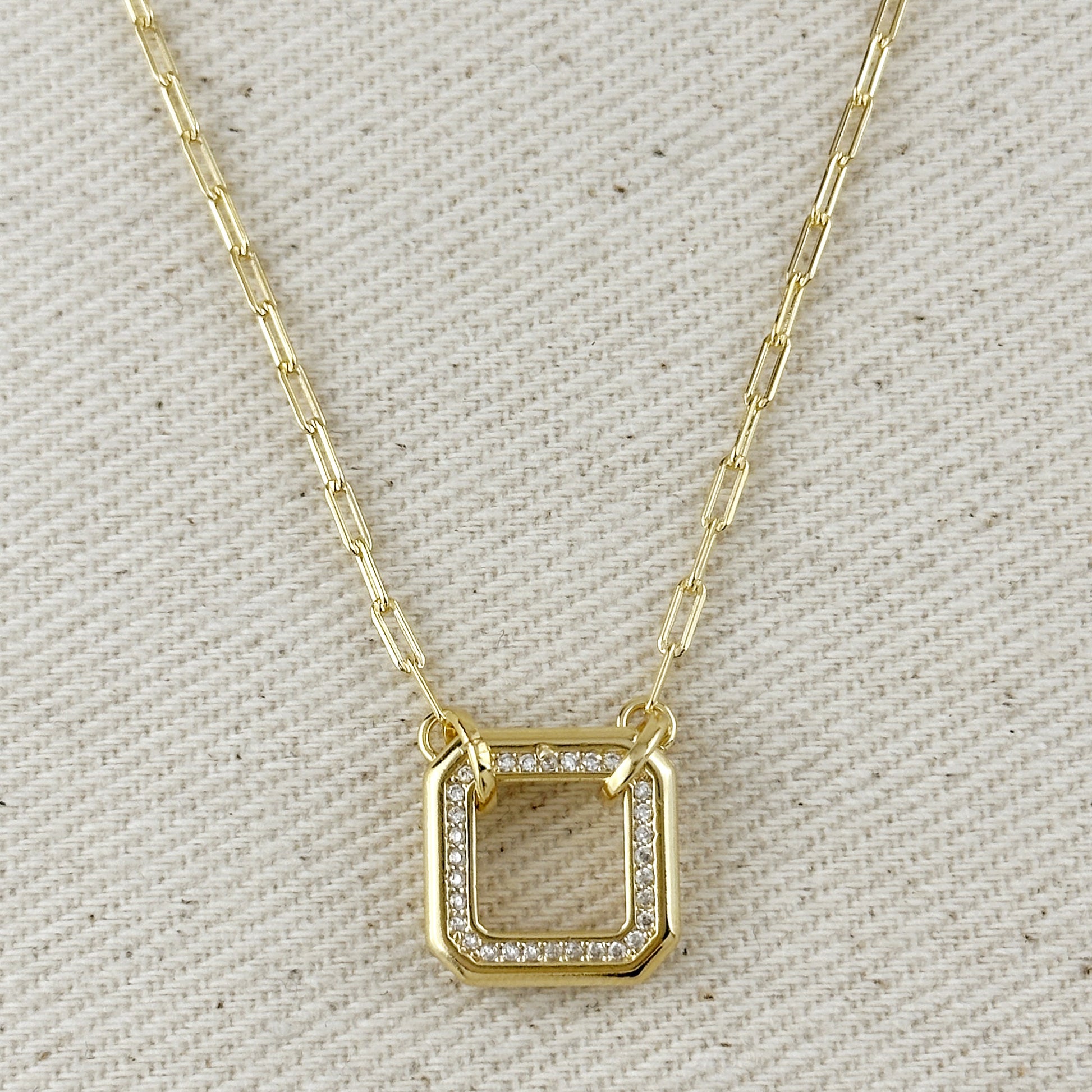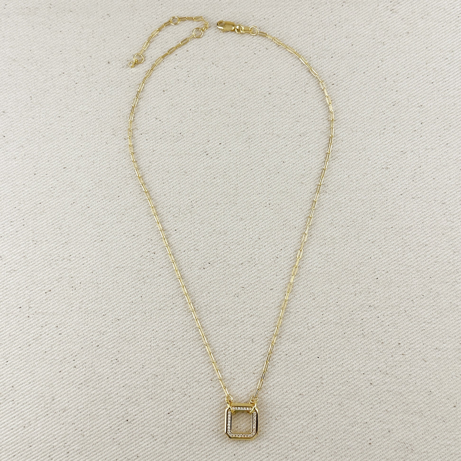 Dazzle with our exquisite 18K Gold Filled Quadratini CZ Necklace, featuring a stunning array of micro cubic zirconia stones meticulously set around elegant square motifs. This sophisticated piece showcases the brilliance of premium cubic zirconia stones that catch and reflect light from every angle, creating a subtle yet captivating sparkle.