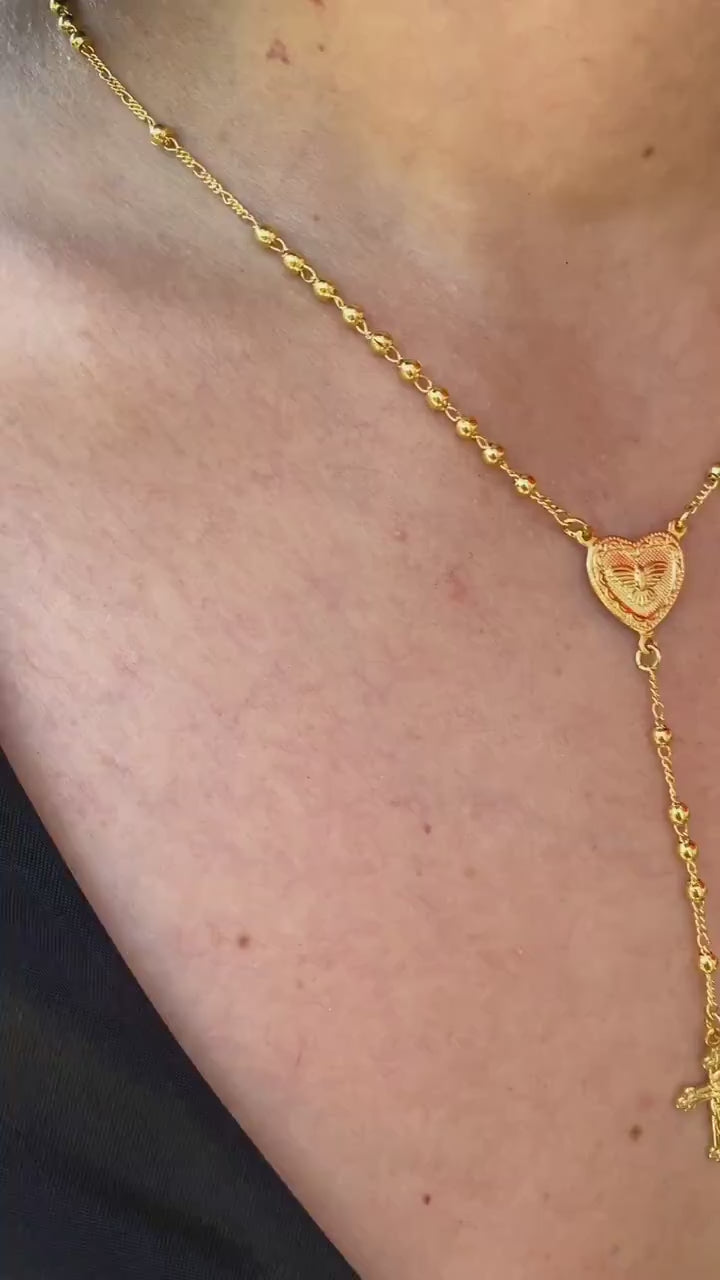 This gorgeous even fashion Rosary features 4mm gold beads made from fine 18k gold filled figaro chain, a Lady of Grace (Mother of Grace, Virgen Milagrosa) medallion and a crucifix.
