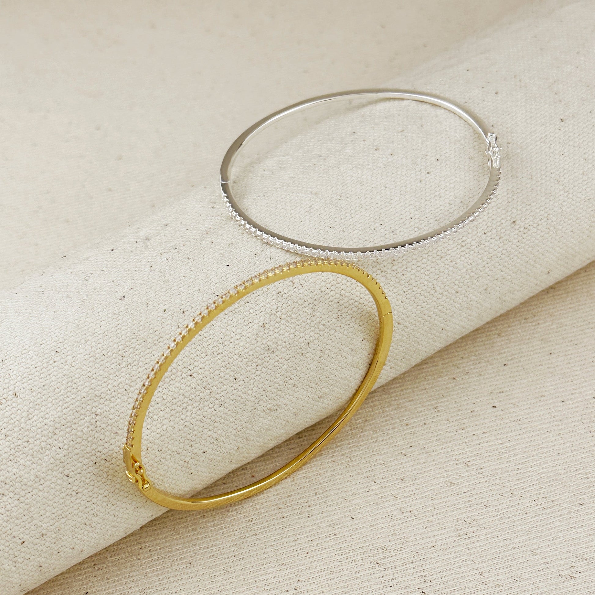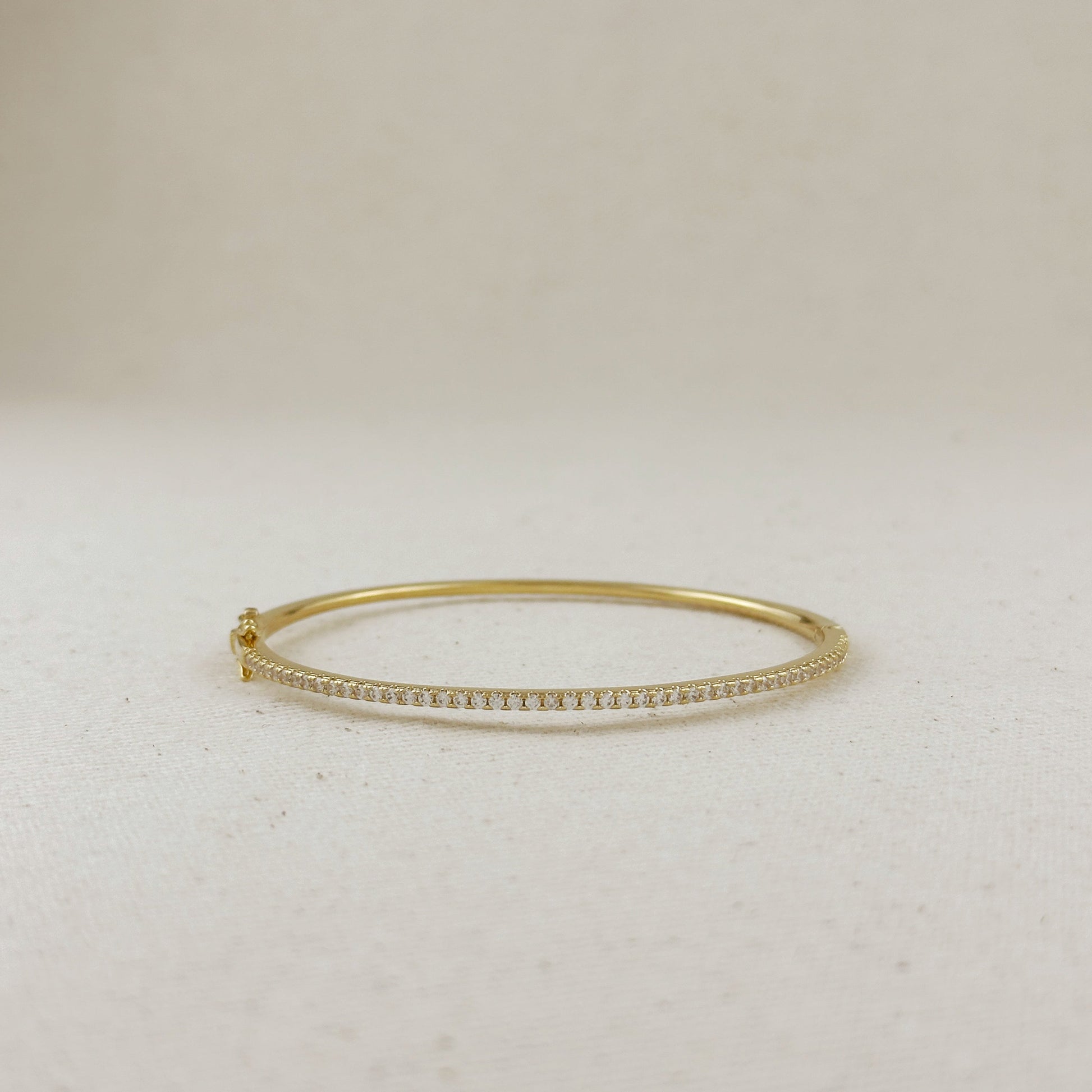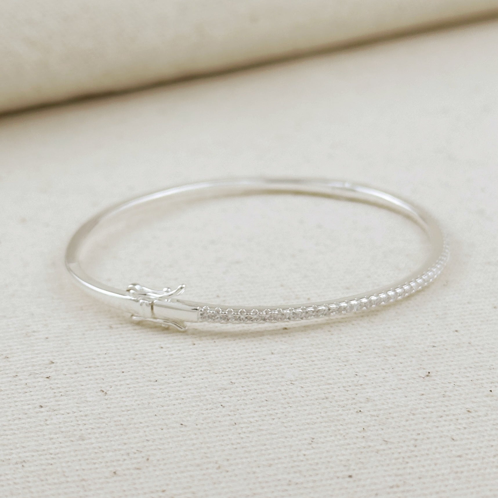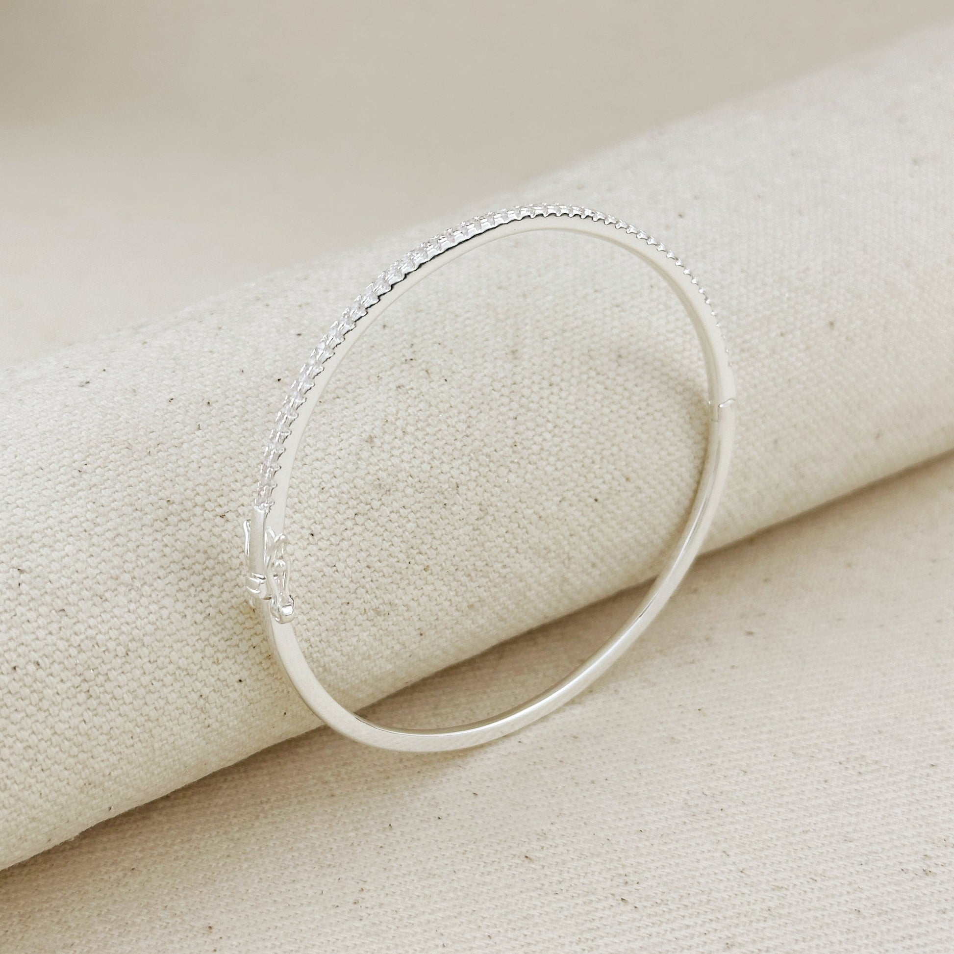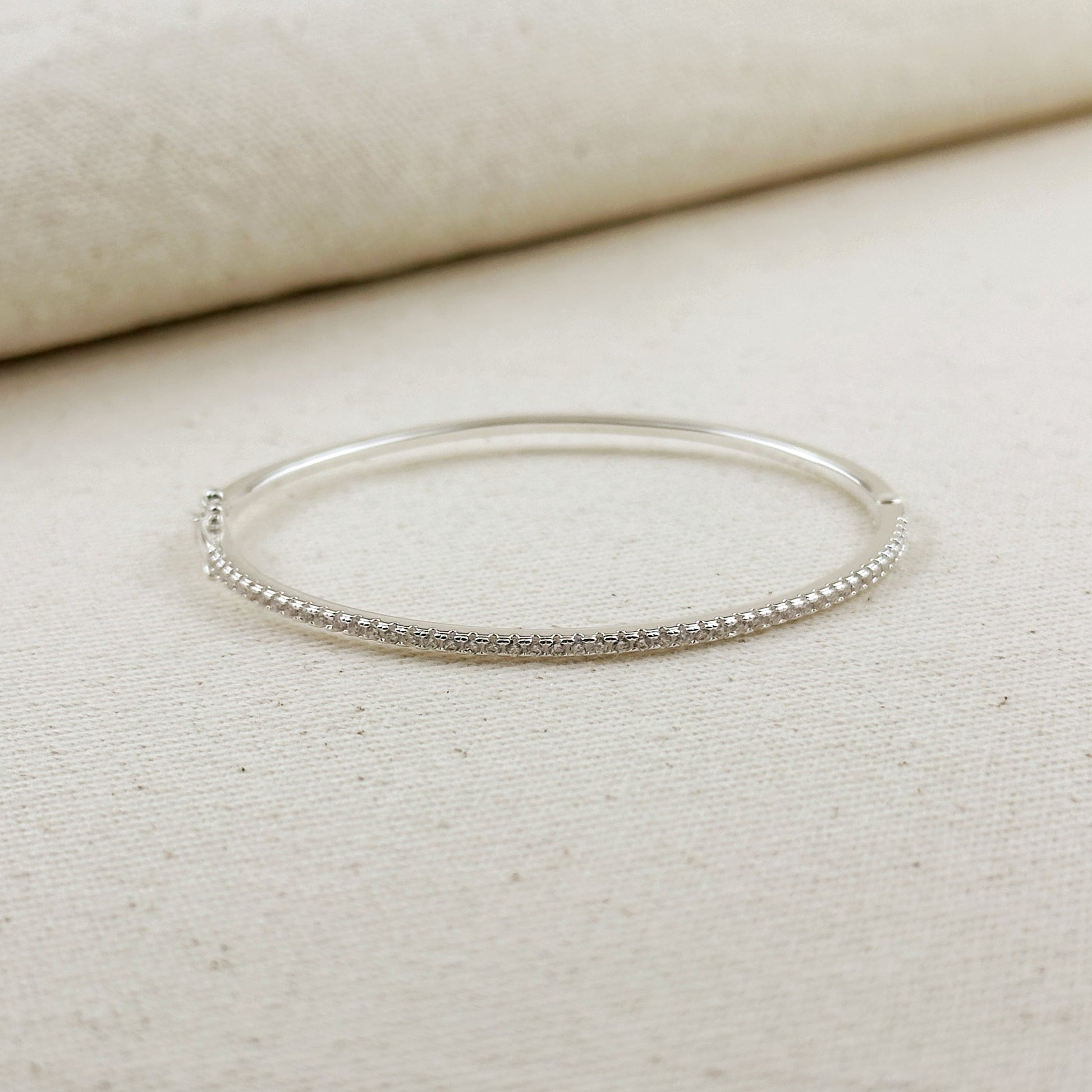 The slender bangle features a continuous line of precisely set cubic zirconia stones, creating a subtle shimmer that catches the light with every movement.