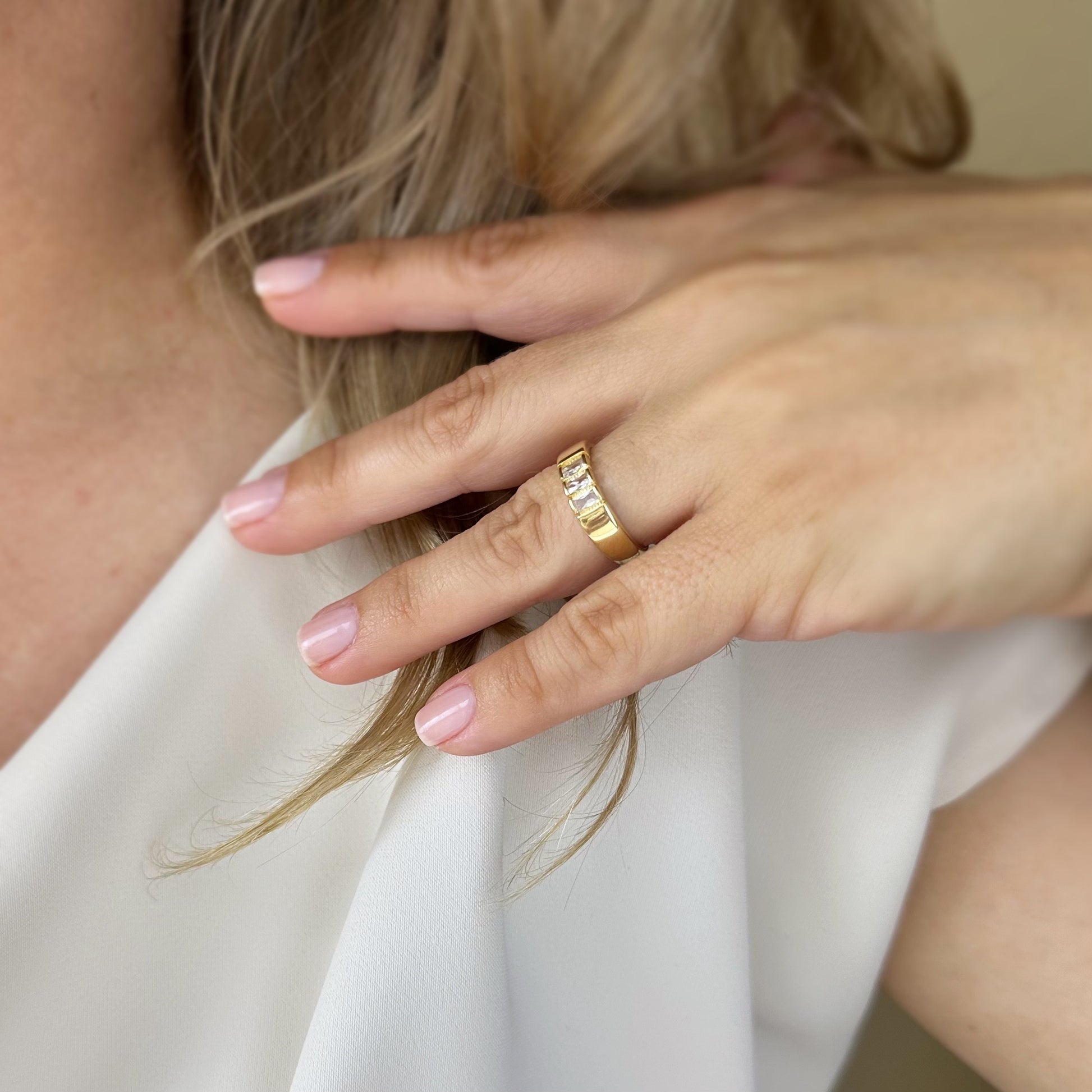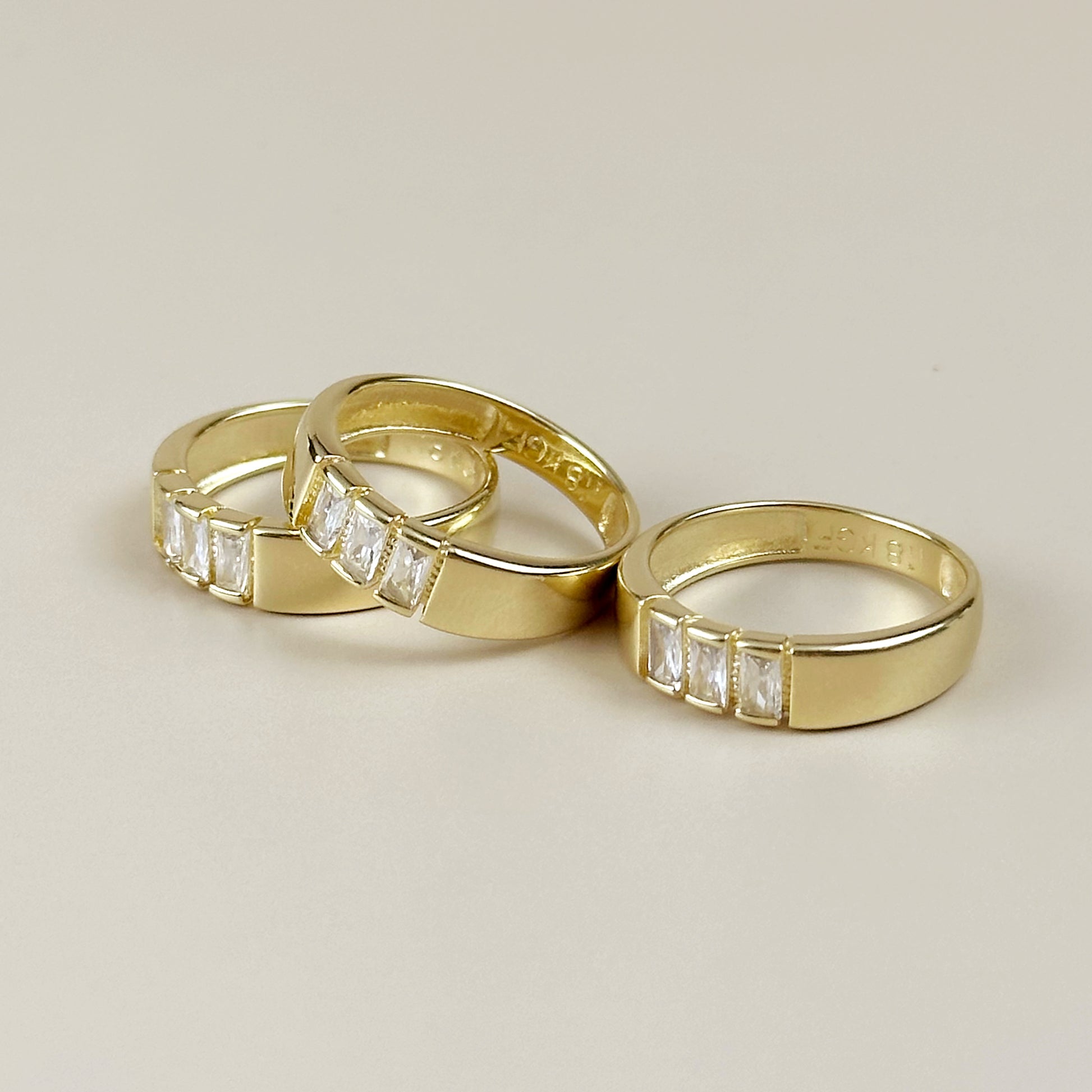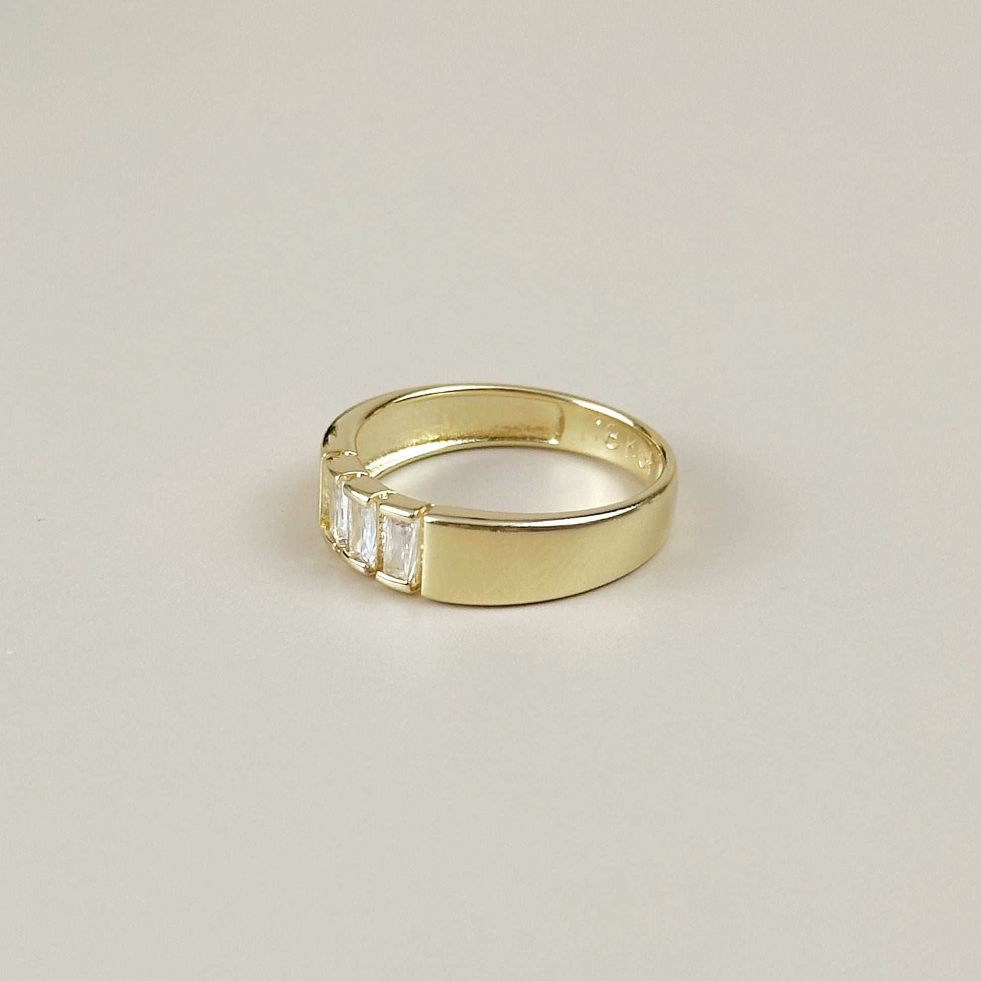 Tags: three stone ring, baguette ring, 18k gold filled ring, cubic zirconia ring, wide band ring, engagement ring alternative, anniversary ring, statement ring, women's gold ring, handmade ring, Brazilian jewelry, hypoallergenic ring, wedding band, trio stone jewelry, CZ diamond ring