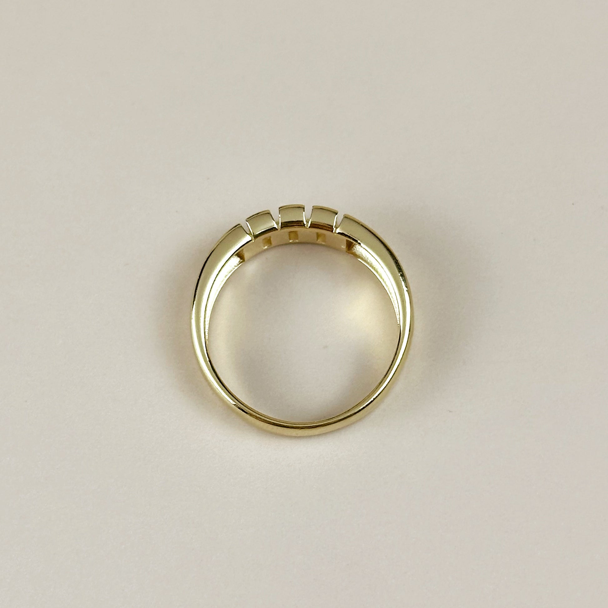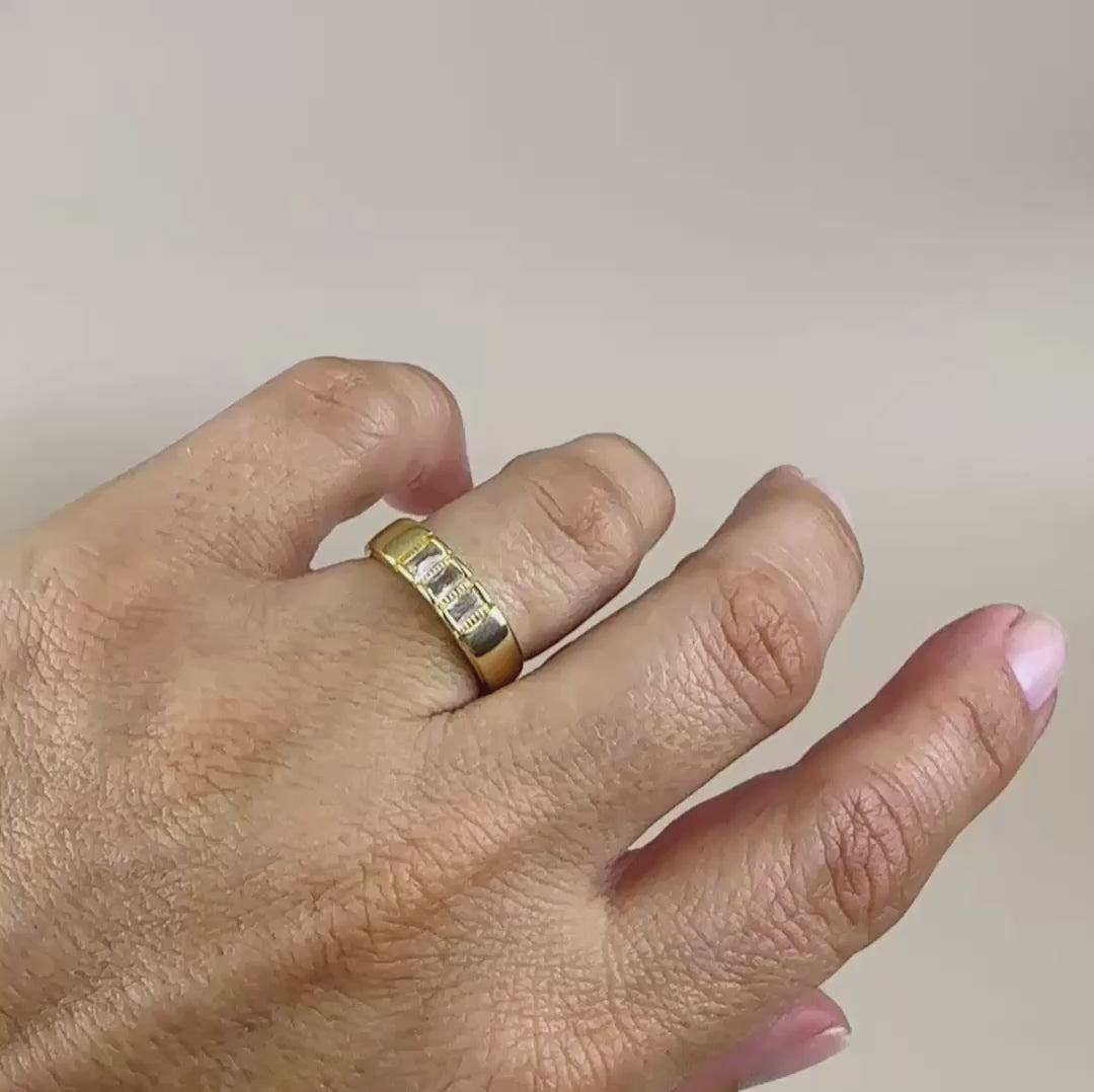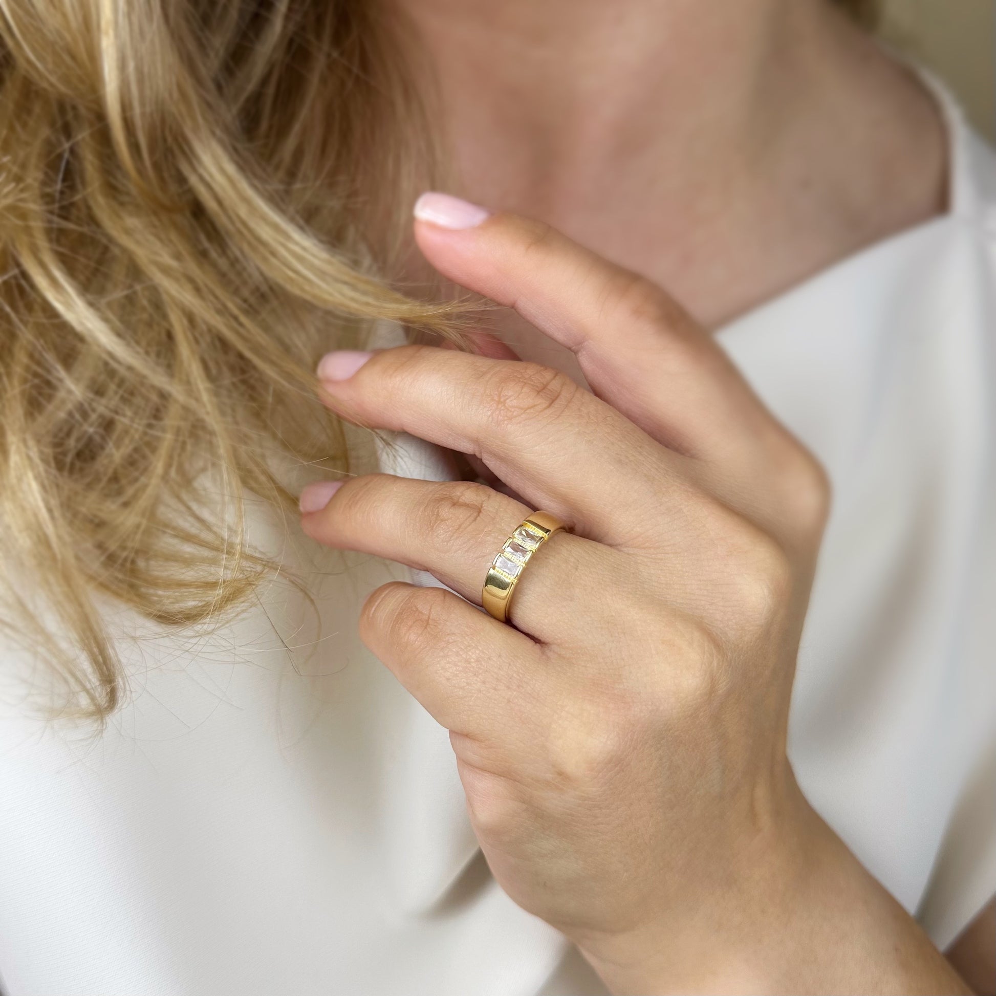 Tags: three stone ring, baguette ring, 18k gold filled ring, cubic zirconia ring, wide band ring, engagement ring alternative, anniversary ring, statement ring, women's gold ring, handmade ring, Brazilian jewelry, hypoallergenic ring, wedding band, trio stone jewelry, CZ diamond ring